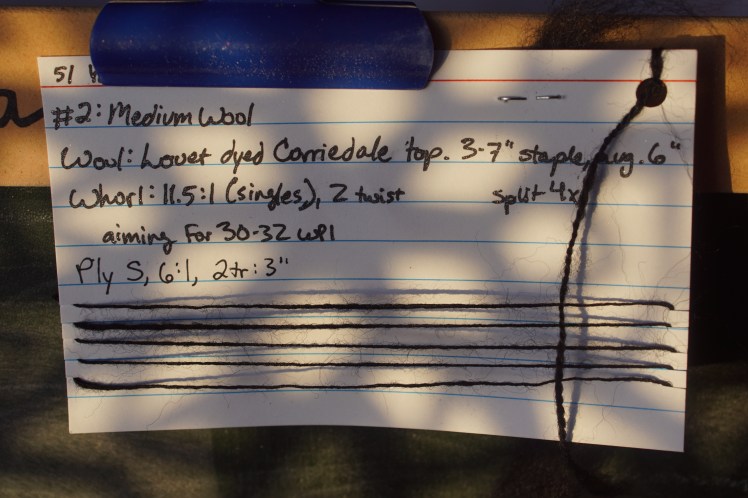 The stats are all on my rav page and on the cards below, so I won’t rehash them. I was again going for that sweet spot of “as much twist as possible before rope,” which I knew would mean less twist than the merino, but I had no idea how much less. So I just went down a ratio – to 11.5:1 – and rolled with it. Middle whorl for a medium wool? Sure.