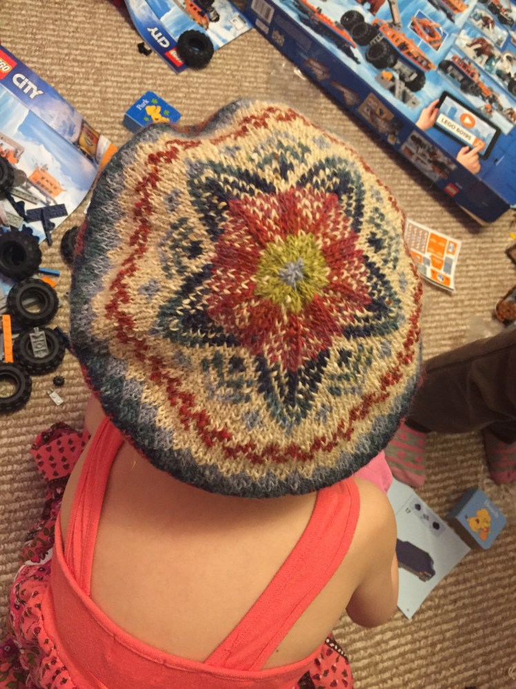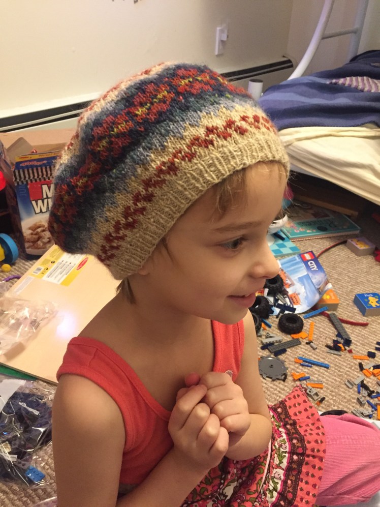 She jammed it on her head and was onto the next thing. At present she’s in her room deep into a new LEGO (which I’m pretty sure is the main point of having a birthday when you are six), the hat presumably still on her head. It fits perfectly. I think I’ll go sneak in and take a picture of it on her head.