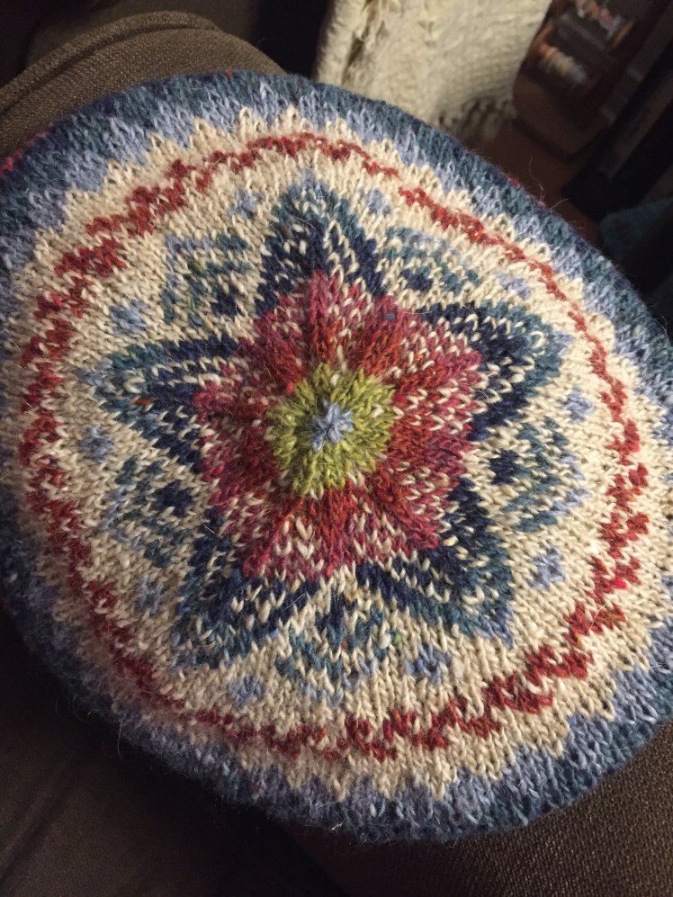 I’m trying to think how many times I’ve knit something in the colors called for in the pattern. It’s very rare for me even to use the yarn called for. I’m usually finding patterns to fit my stash, or at the very least tweaking a pattern to make it feel like my own. I could think of two other times. One was a kit Mom got for me when I was eighteen; the other was a kit that I knit on commission (also a Kate Davies hat, as it happens).