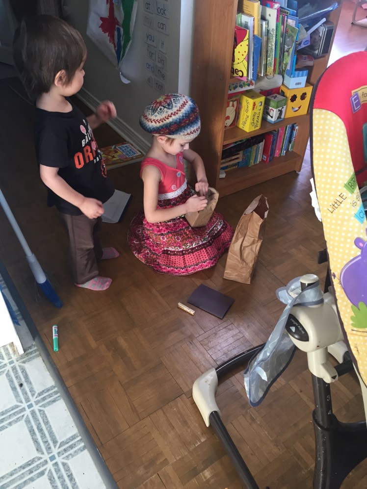 I decided last night to turn N’s present time into a scavenger hunt. Here she is finding the hat.