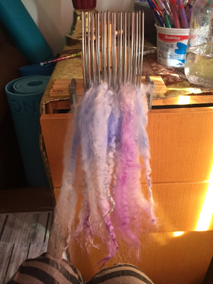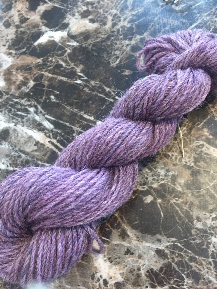 I started with some greyish purple top from a dyer in the UK. She said it’s “Teesdale,” which I hoped was the same as Teeswater.