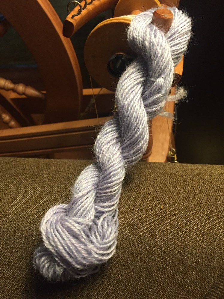 I ended up with a yarn that I really liked. It spun up easily into a light, plump yarn. Even though the staple is short, the crimp acts like a longwool; this yarn is clearly just happy with a low twist and 25 degree angle of ply twist.