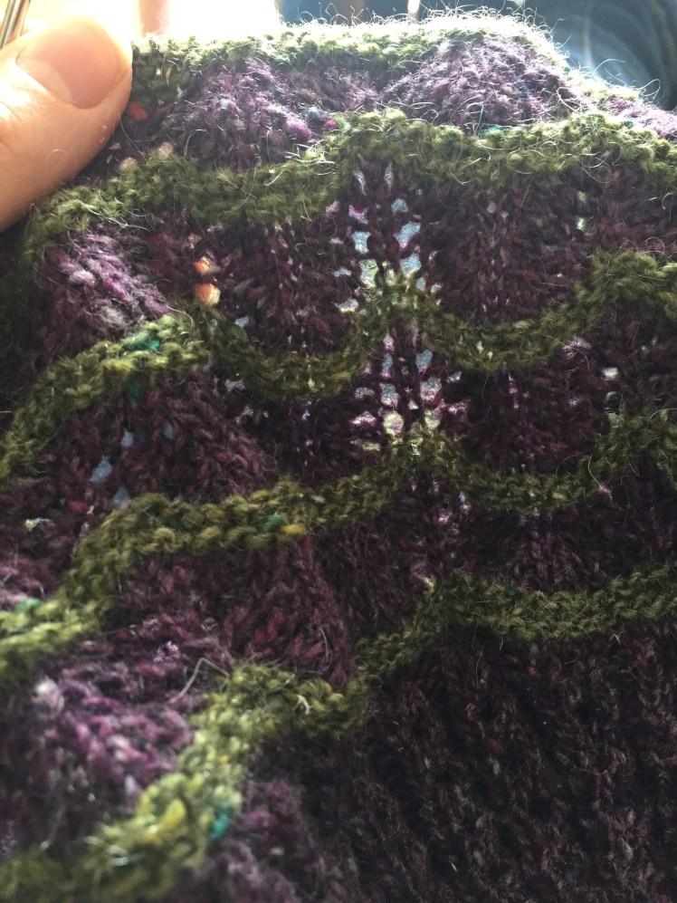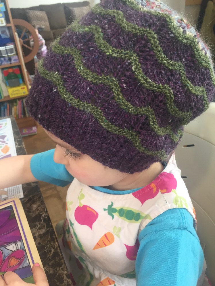 I took out one seventh of the pattern to make it more M sized, but I kept all the length in it. As a result it has a considerable slouch on her (which I think is darling but she probably does not). But I can still get it on my head, so hopefully that means it’ll bring her joy in future years as well.