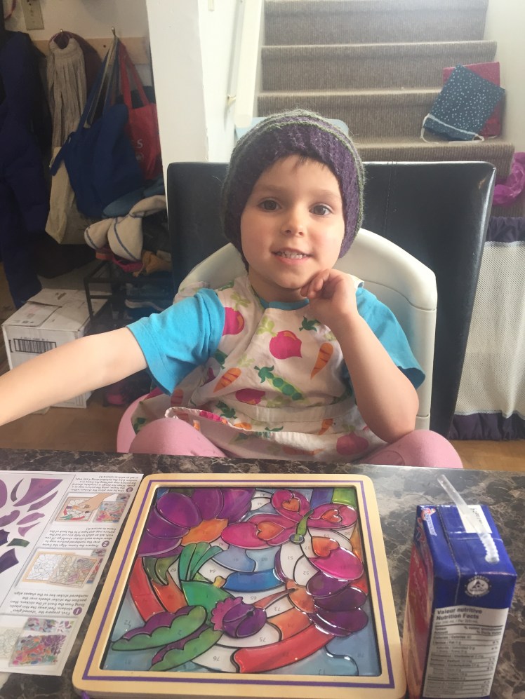 I’ve been wanting to make her a birthday hat, since her sister got one. I thought she wanted an Every Flavour, but when she saw me flipping through the Milarrochy Heids book she wanted to pick her own. She liked most of them, but we settled on Roamin‘ by Lynette Meek.