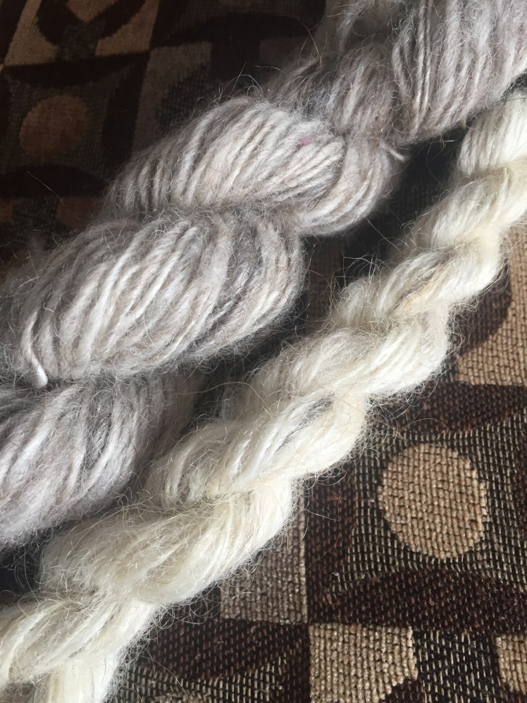 I wouldn’t characterize these fibers as amazingly soft, but they’re certainly soft enough, and spun up so very bouncily this way. I have to imagine that this is what Icelandic lace yarn is spun from, fine singles ready for lacework that’s warm but fine.