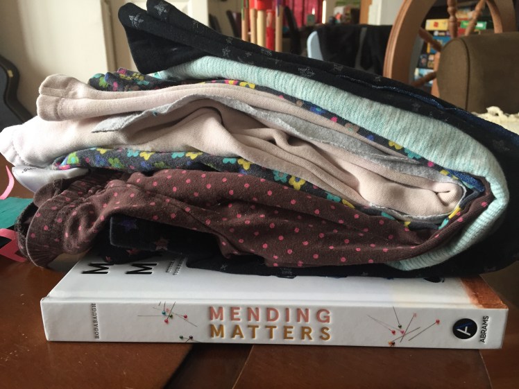 I mended a few more pairs of socks, and decided I needed a break. So next I made a plan to attack the girls’ leggings.