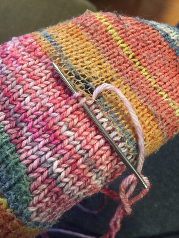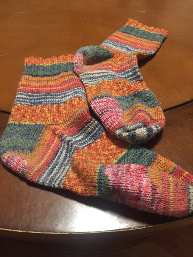 I spent several days giving a new lease on life to this faithful old pair of socks. I bought the yarn ten years ago in South Africa, and they were the first pair of socks I made that really fit me properly. I wore them for seven years before they threatened to give out. They wore in a remarkably even way on the ball of the foot, so I ended up duplicate stitching a very wide area. It might have been faster to just re-knit the foot, but I couldn’t quite face that. It was a lot of work, but after all the service these socks gave me, it seemed they deserved it. It’s nice to wear them again. They’ve been in the mending basket far too long.
