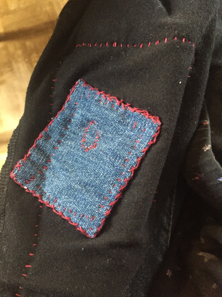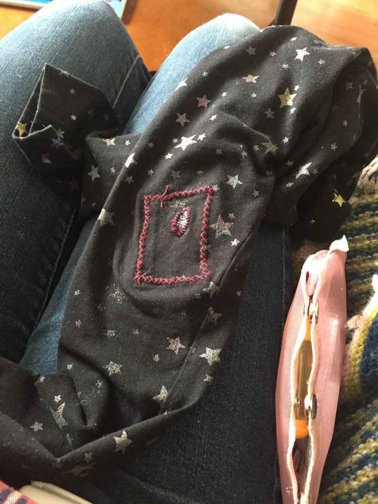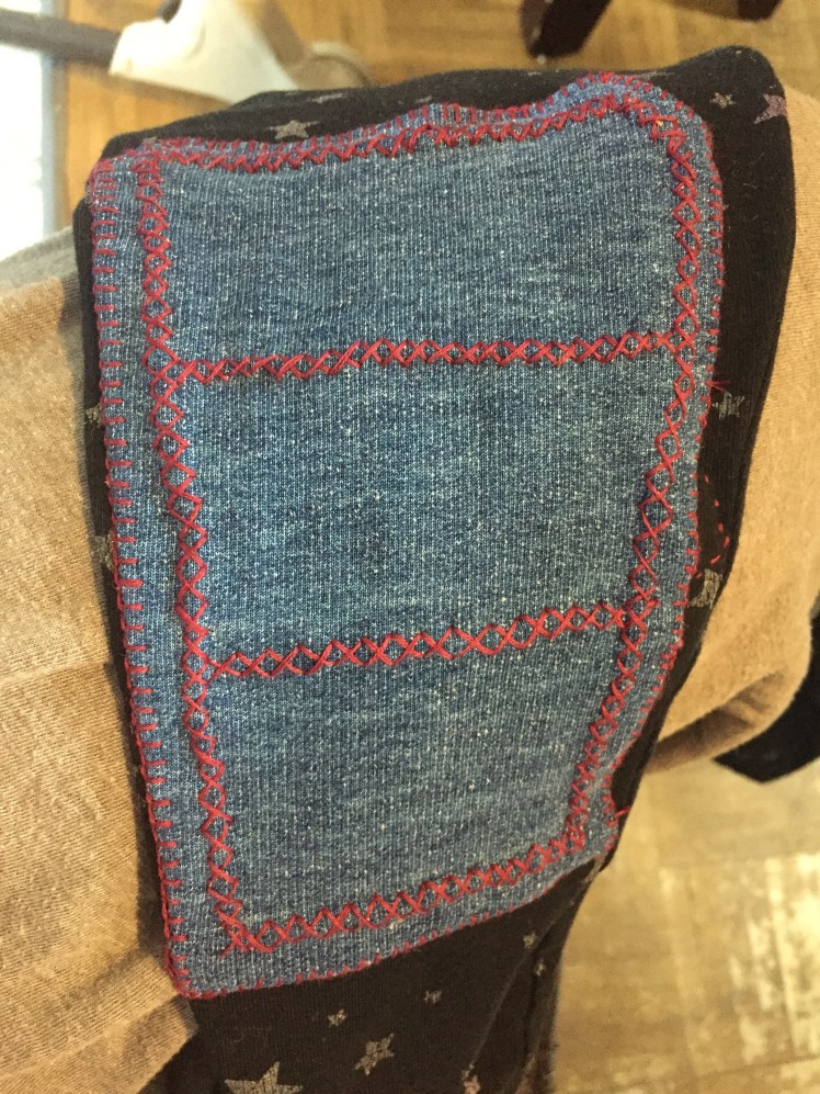 I was going to do catch stitch on the edge, but remembered as I started that blanket stitch is also stretchy and is way easier. So I went around with that for smooth edges, and added a couple more lines of cross-stitch since it’s such a large patch.