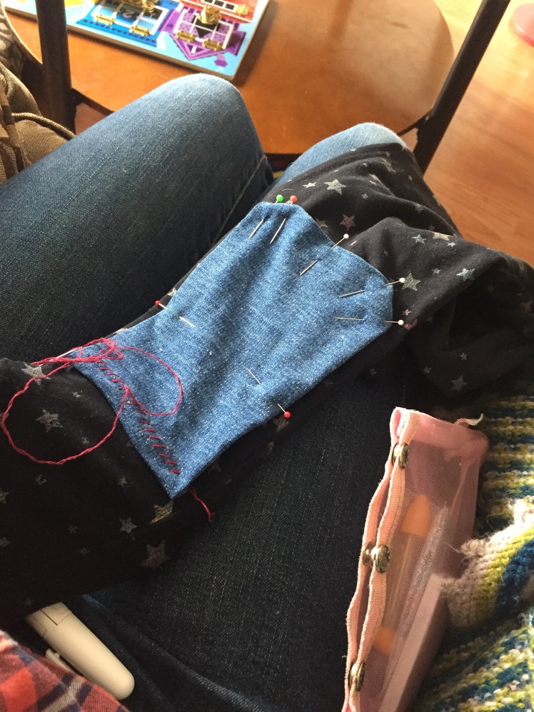 I stuck the smaller patch in and pinned it. It wasn’t straight; I should have fixed it. Oh well. I did it with the sturdier side facing in towards the leg, so both of the more fragile sides of that patches would face each other. I tacked the patch on with the first half of a cross-stitch.
