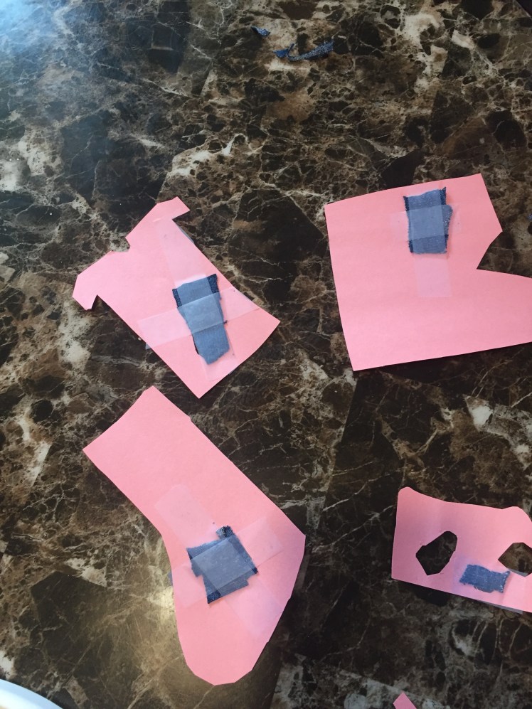 While I was working, N took my cast off bits of patch trimmings, made clothing shapes out of paper, and taped little patches to them. She loves the idea of patching and was very annoyed that I wouldn’t let her patch all her pants herself.