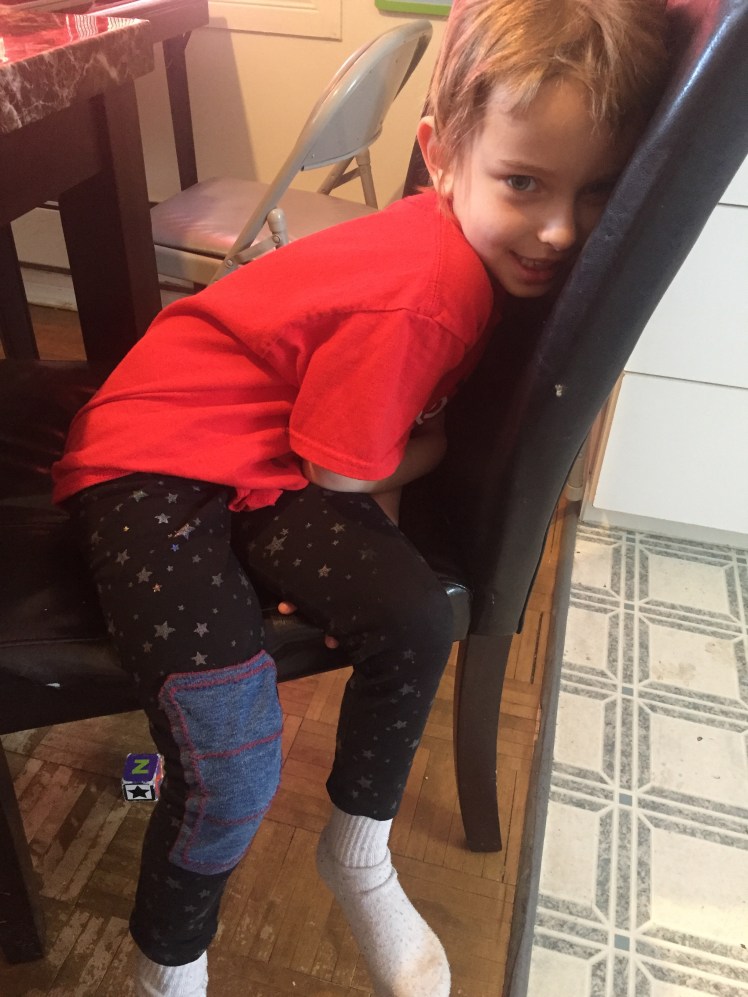 After my griping and moaning in last post, I realized I just needed to have a go at mending Ns leggings. I’ve mended her leggings before with creative reinforced darns, but they always tore again right away. Or she grew a couple inches and a new knee wore out.