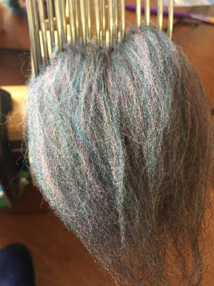 Blending colors on combs is amazingly effective! I only did one pass, and the colors were completely heathered together. I didn’t want them any more blended than that. When blending on combs, the colors pass through each other on both axes from the way you lay them on, unlike carding where they only blend down through the layers.