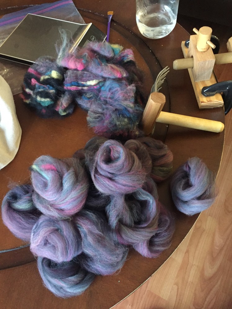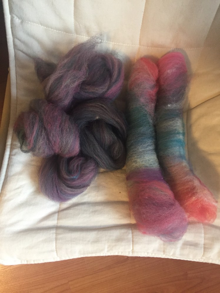 These two process are so different. You can see in this picture how the streaks of color go straight down the length of the combed top, while they cross perpendicular to the length of the rolag. That’s the base difference between these two preparations, and the foundation for the two different techniques used on them to make two very different types of yarn.