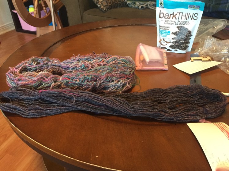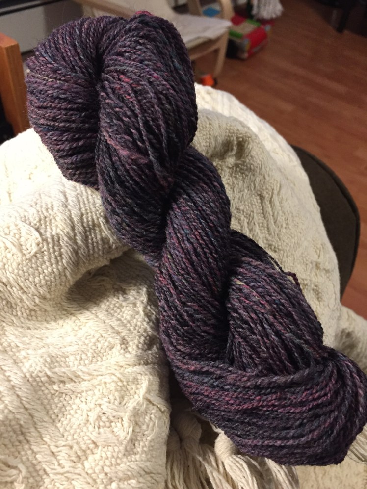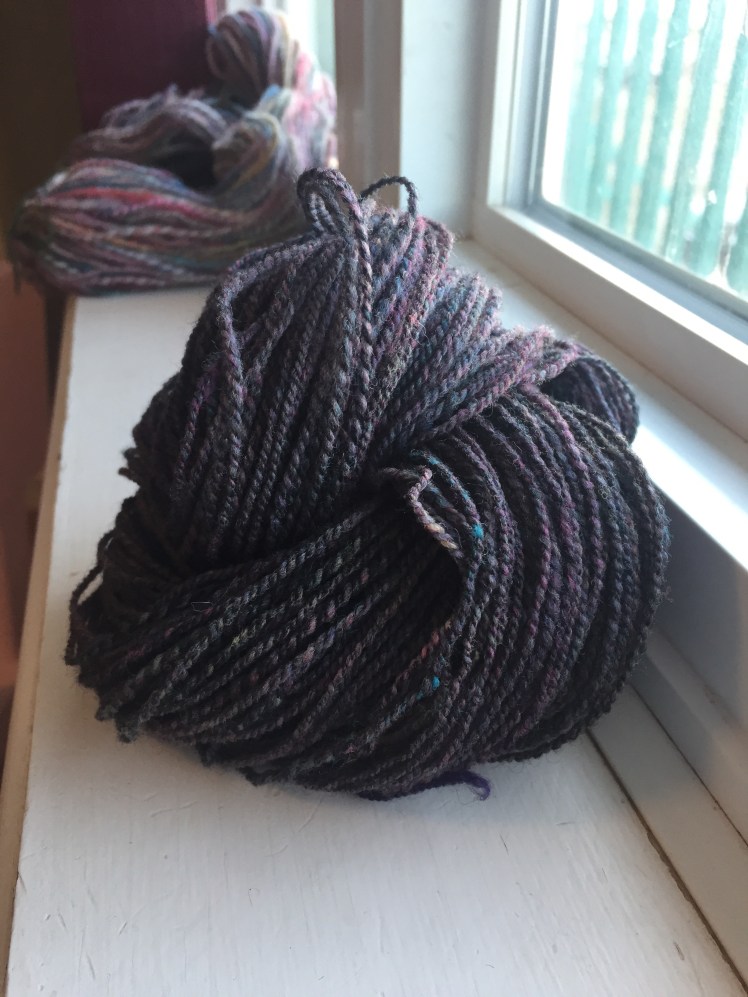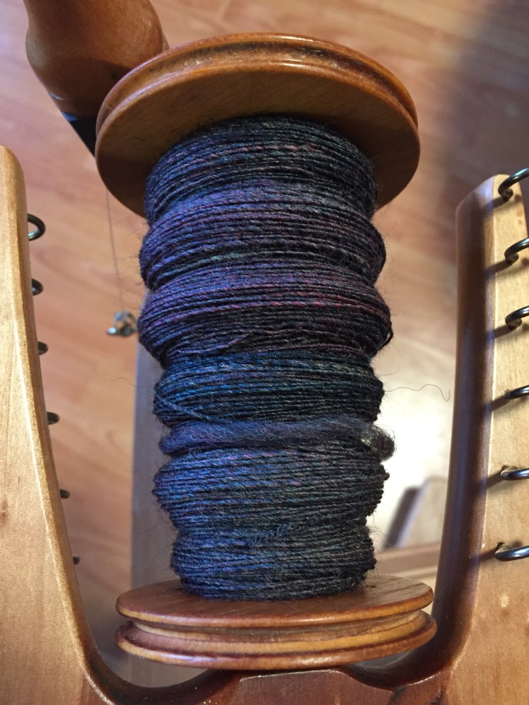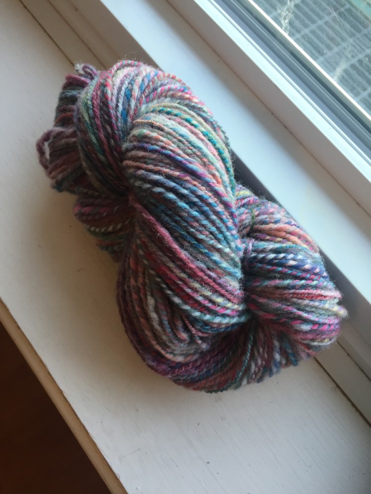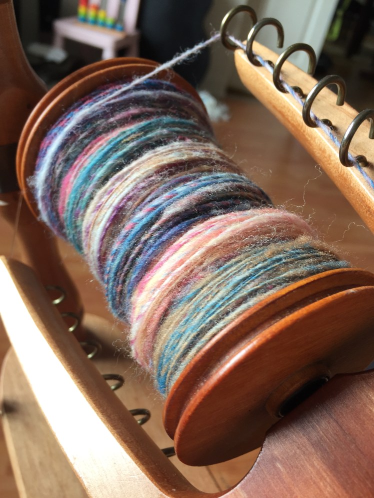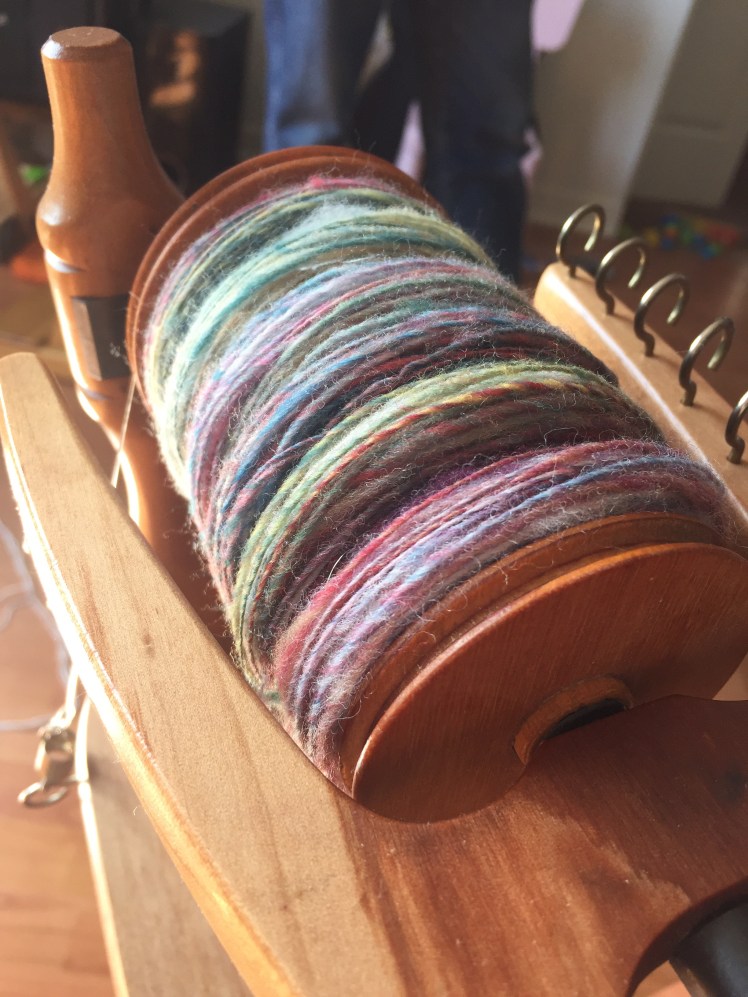 I did not, in the end, sit on my hand. But what I had to do generally was use my supporting hand to hold the thread near the oriface so I could start drafting back, then I could let go while my drafting hand went about halfway back, then I hung on again to double draft. These rolags seemed to want double drafting, and this is the first time I’ve double drafted through a whole spin, even if just a 1.5 oz one. I’ll still call that growth, even though I haven’t hit that unsupported milestone.