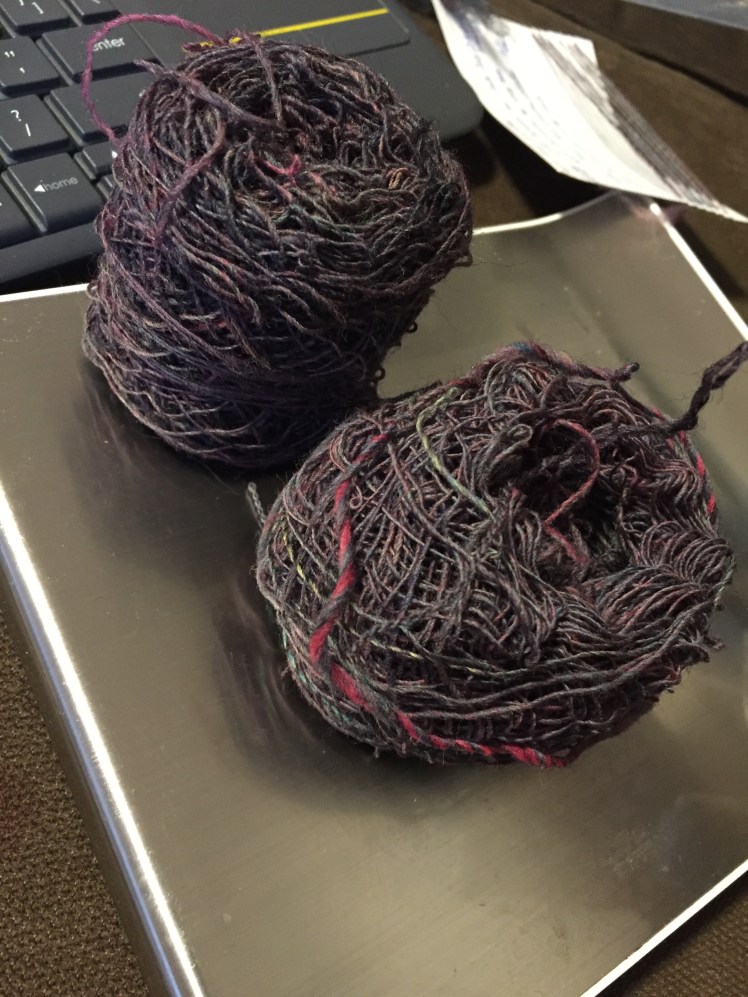 Here’s a closeup that shows you the surface textures of the two yarns. The woolen yarn is fuzzy from the disorganization and the thwacking, while the black is very smooth from perfectly aligned fibers and gentle finishing. You can’t tell in this picture, but the worsted does have a little shine to it.