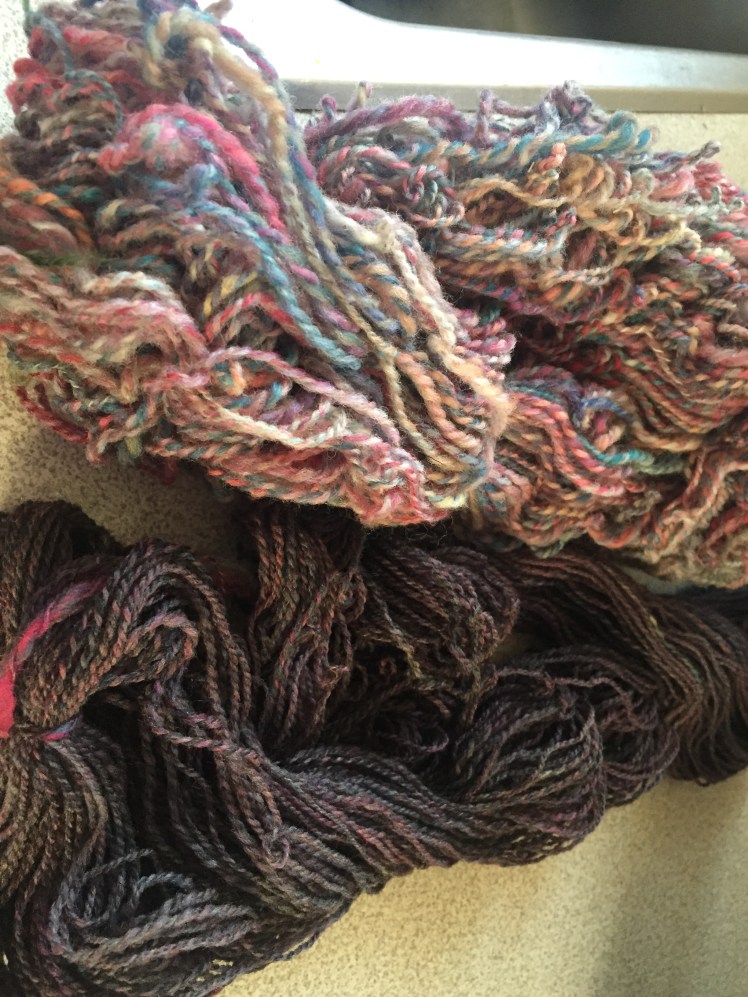In regards to how they changed in finishing: I was surprised that there wasn’t much difference there. Both poofed a good bit, to 10 and 14 WPI respectively. That’s more about the Targhee than the spinning style, I expect. Both have excellent grist for their size – over 1100 and over 1600 YPP. It’s hard to compare when they are such different diameters.
