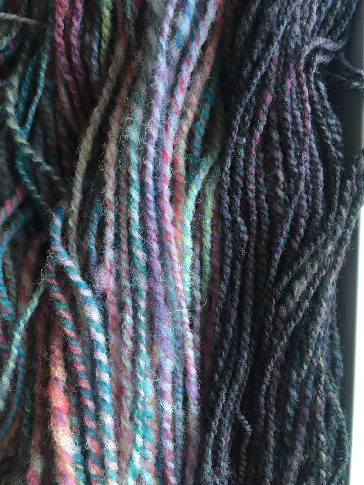 Yesterday I catalogued the prep for these two spins, on the extreme end of woolen and worsted yarn. Today I’ll talk about the spinning thereof and the yarns they made.