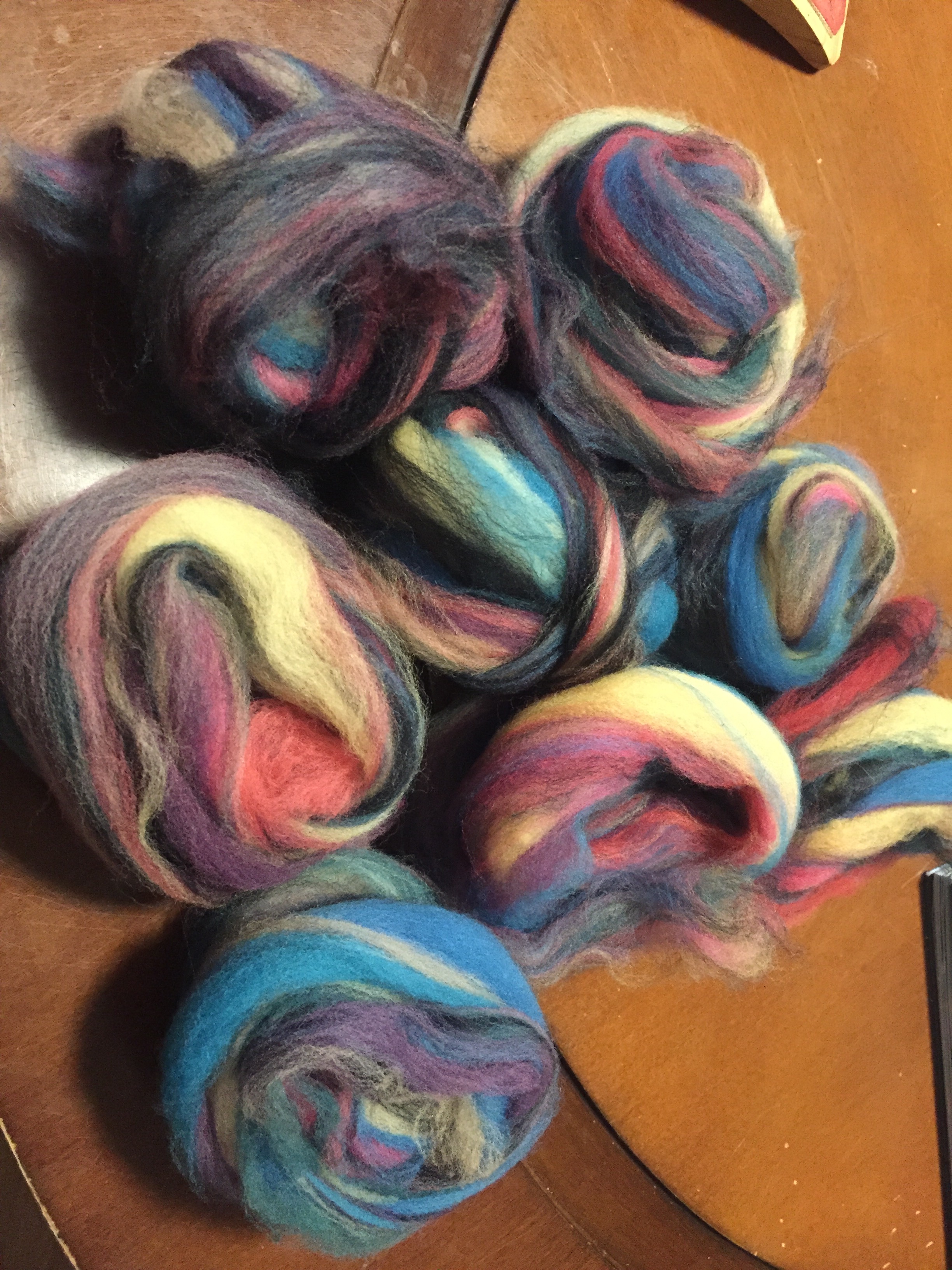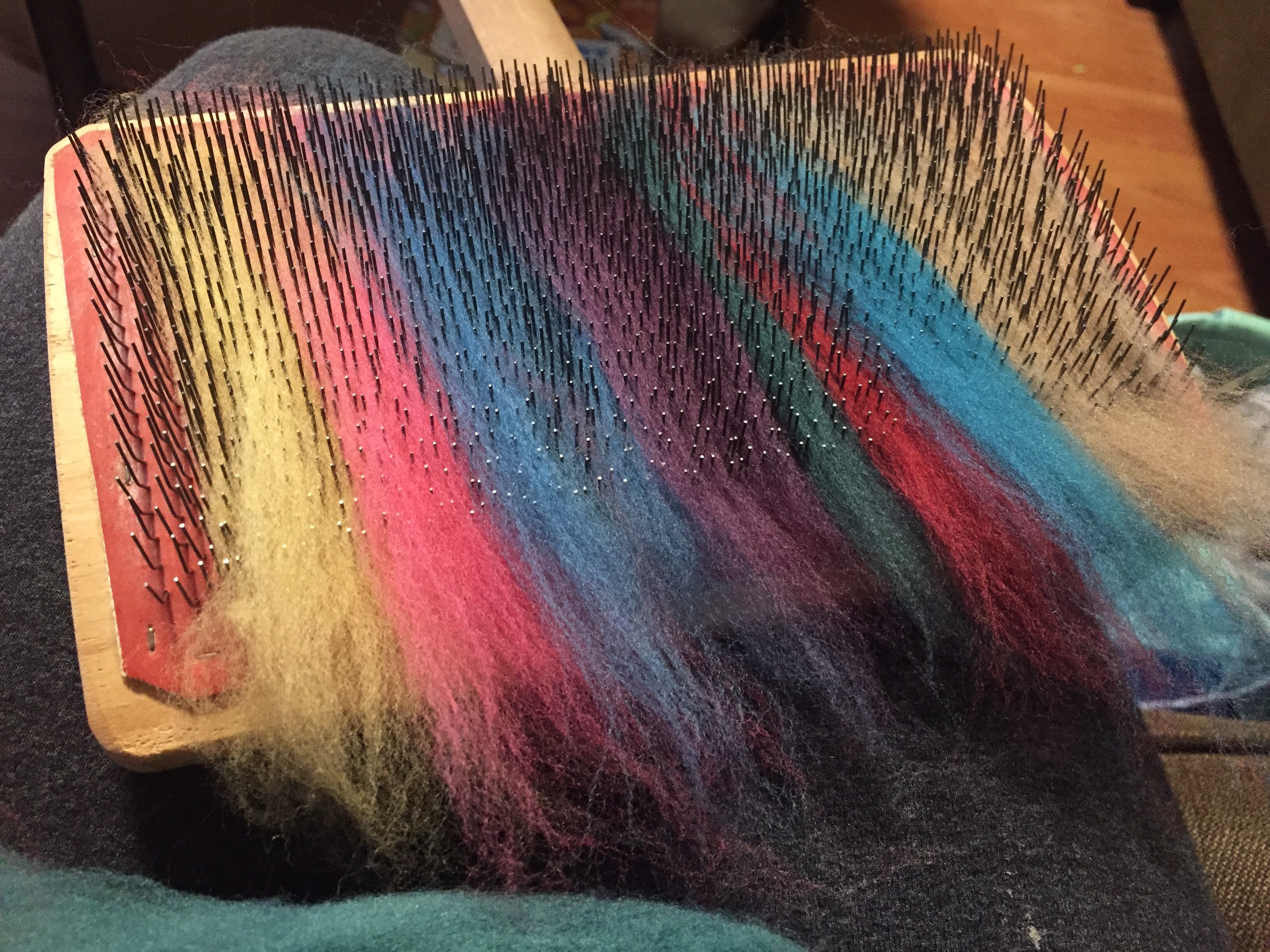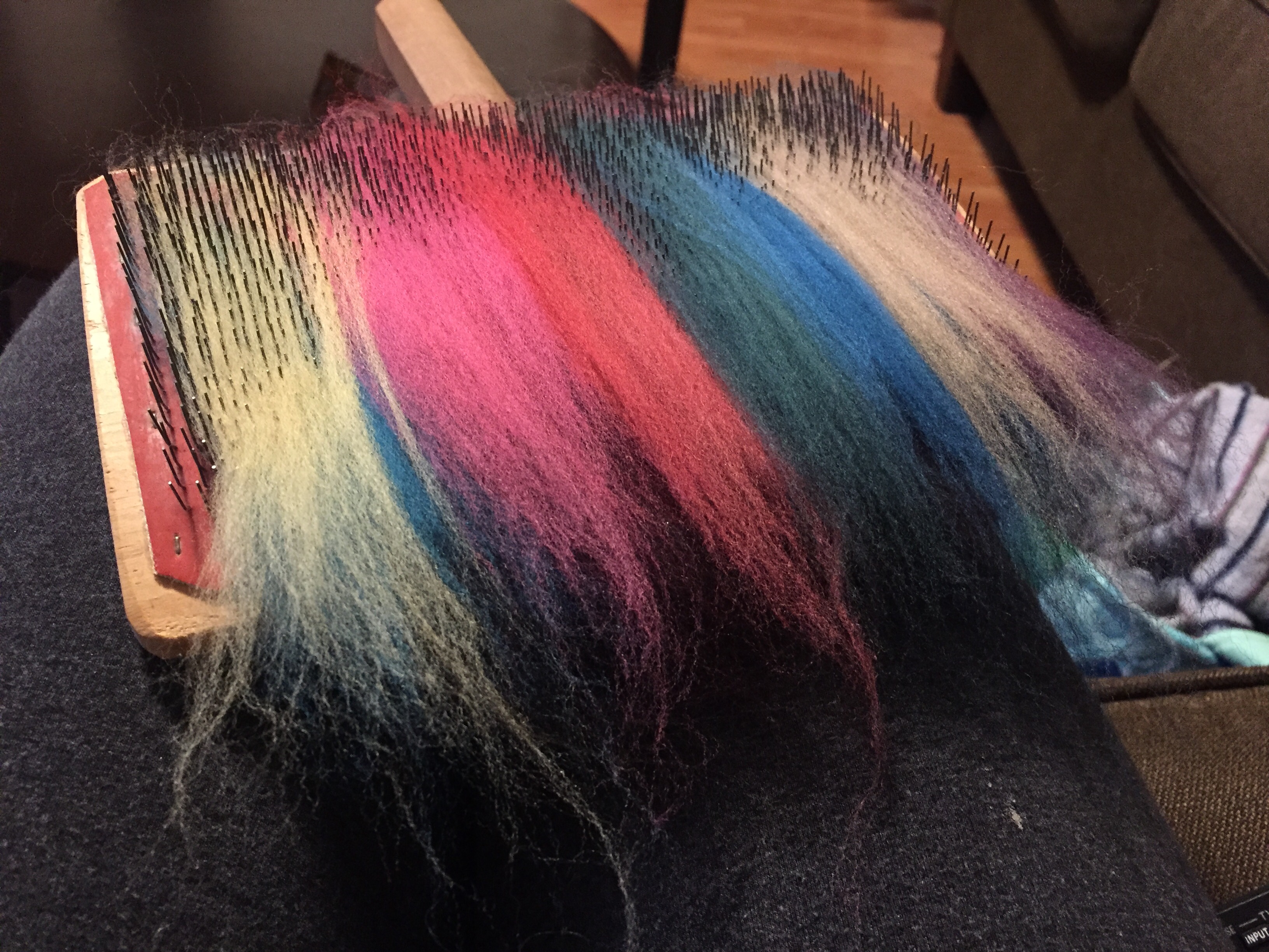 The spinning wasn’t a dream. It wasn’t like spinning combed top, but it was like a very easy combo draft. (At least, easy for holding nine colors together.) The color effect was very like a combo draft too.