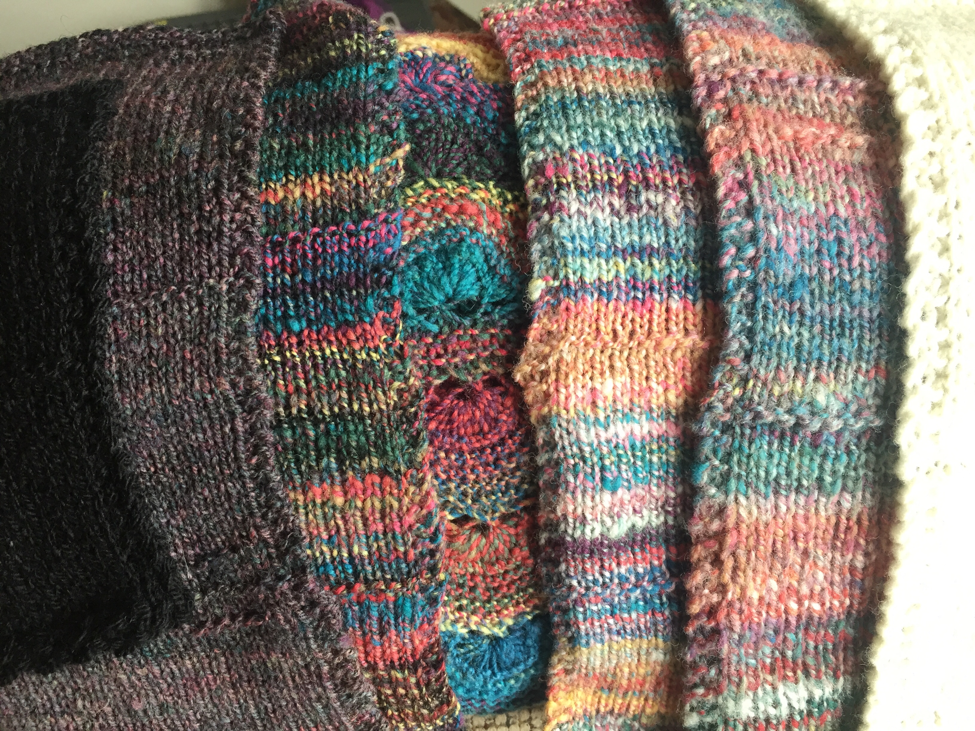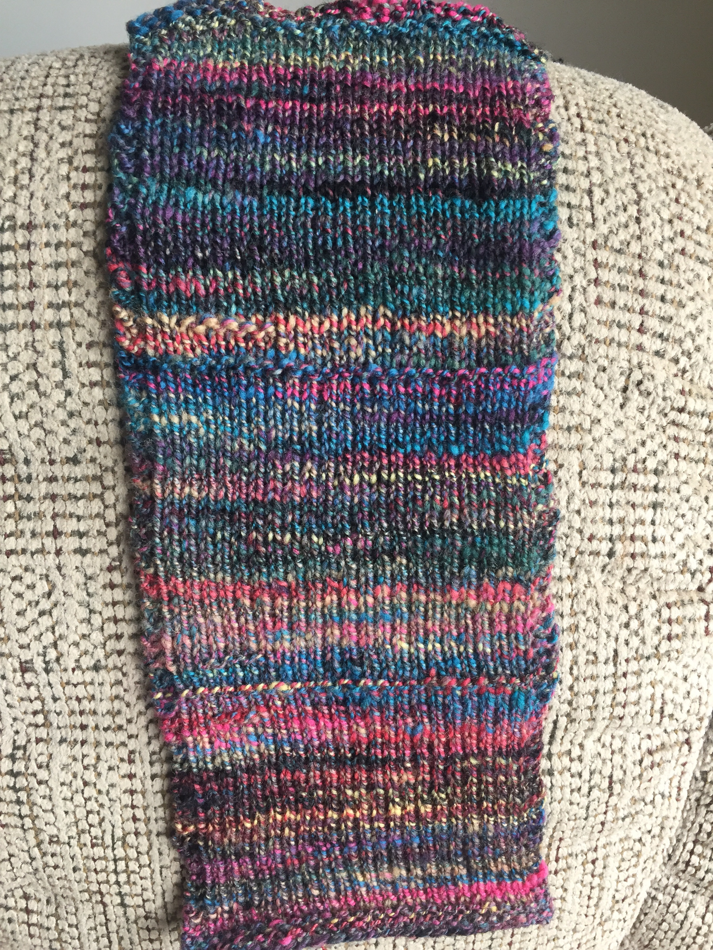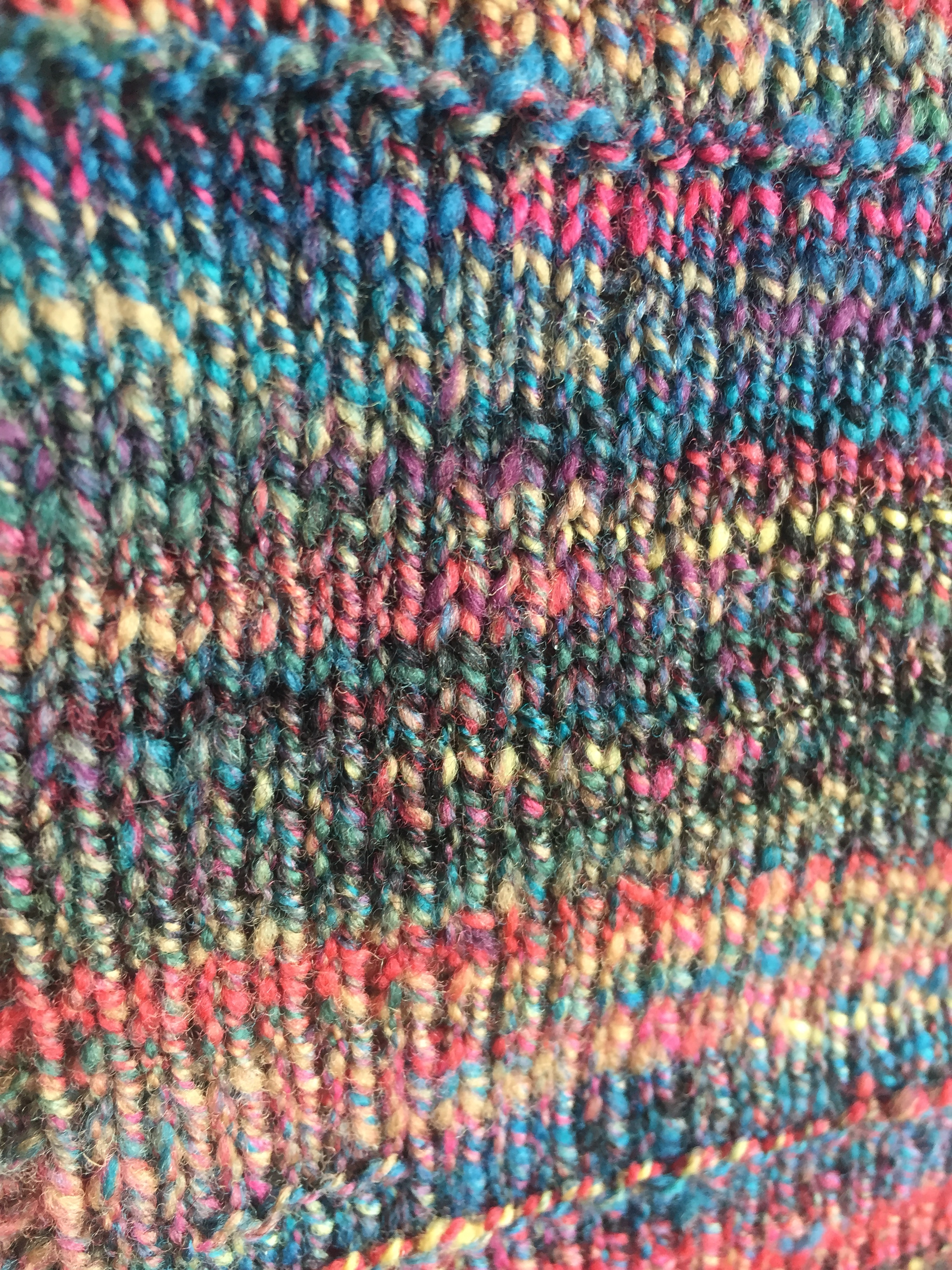 The spinning wasn’t a dream. It wasn’t like spinning combed top, but it was like a very easy combo draft. (At least, easy for holding nine colors together.) The color effect was very like a combo draft too.