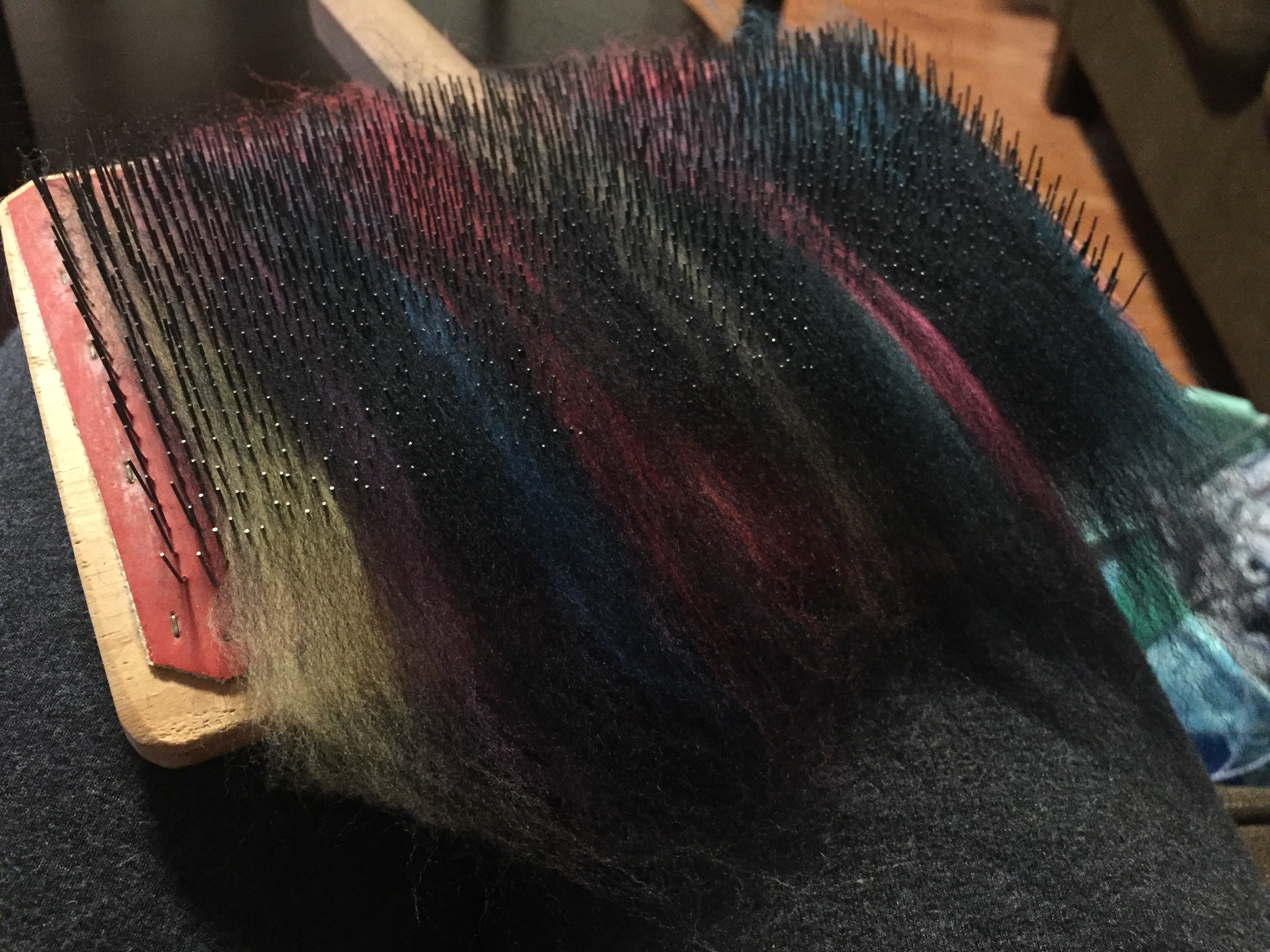 Fiber cigars are a new thing to me. The idea is you card normally, but instead of rolling up the card to make a rolag, you roll across the card. Here’s how I did it.