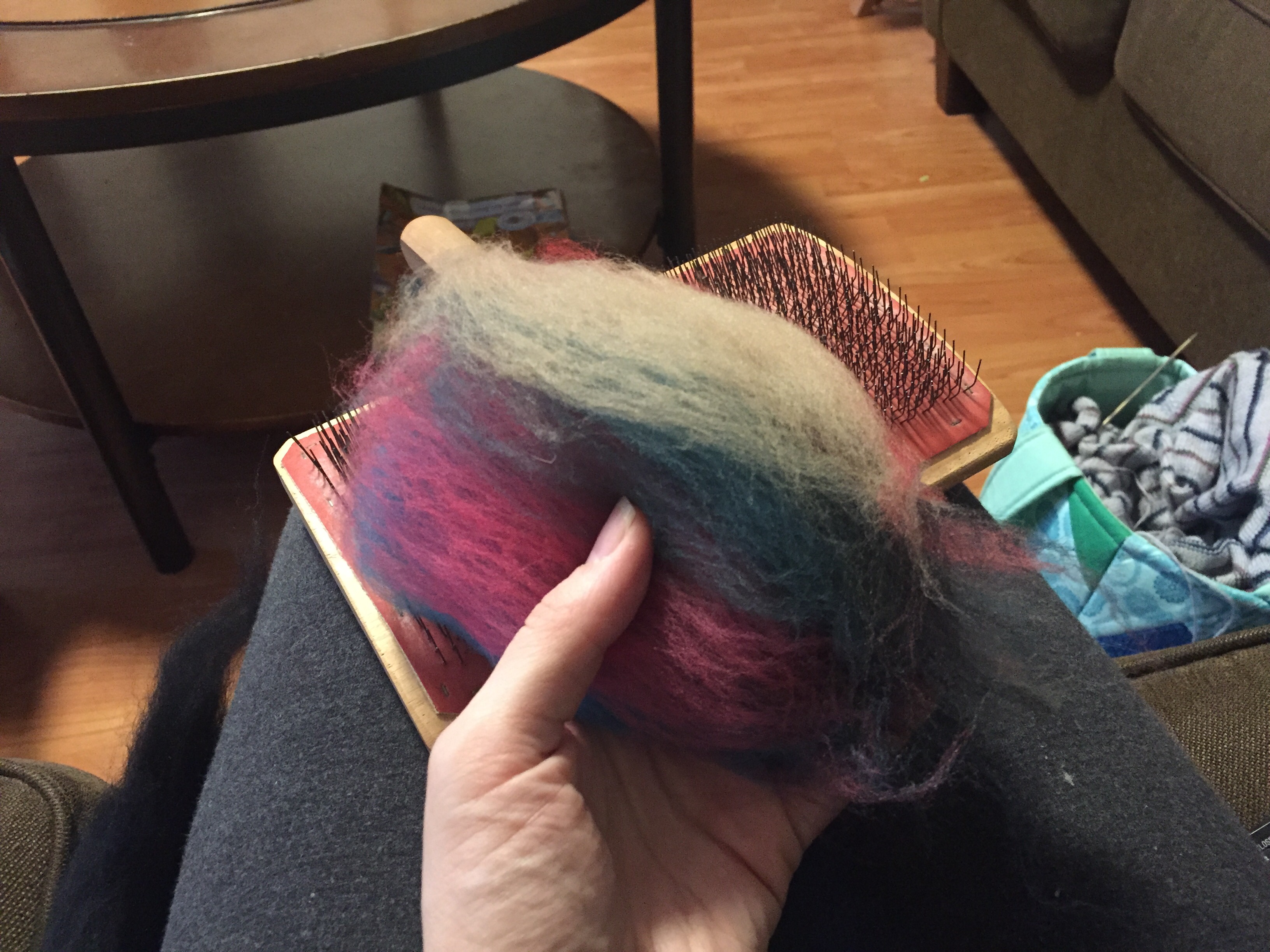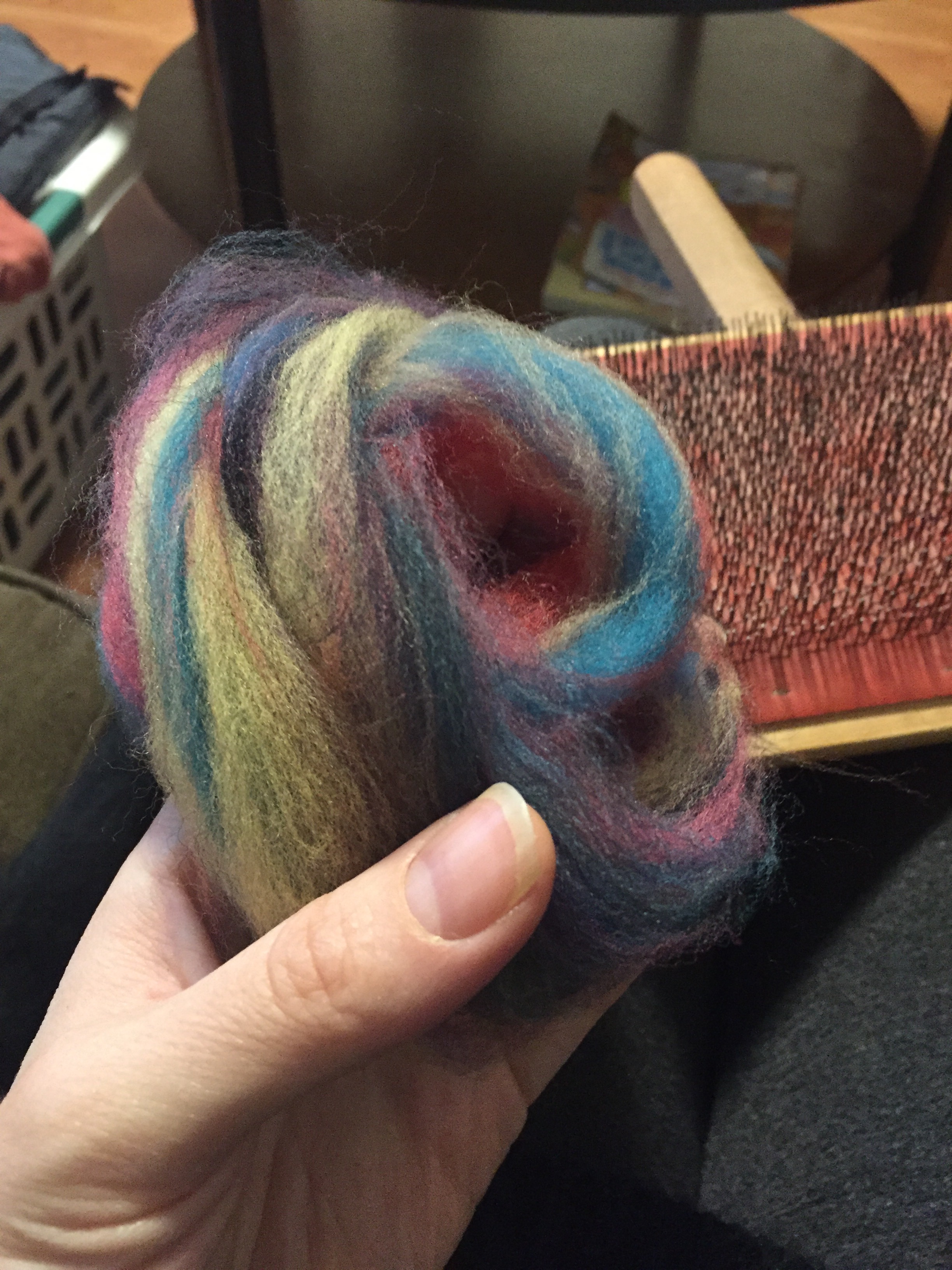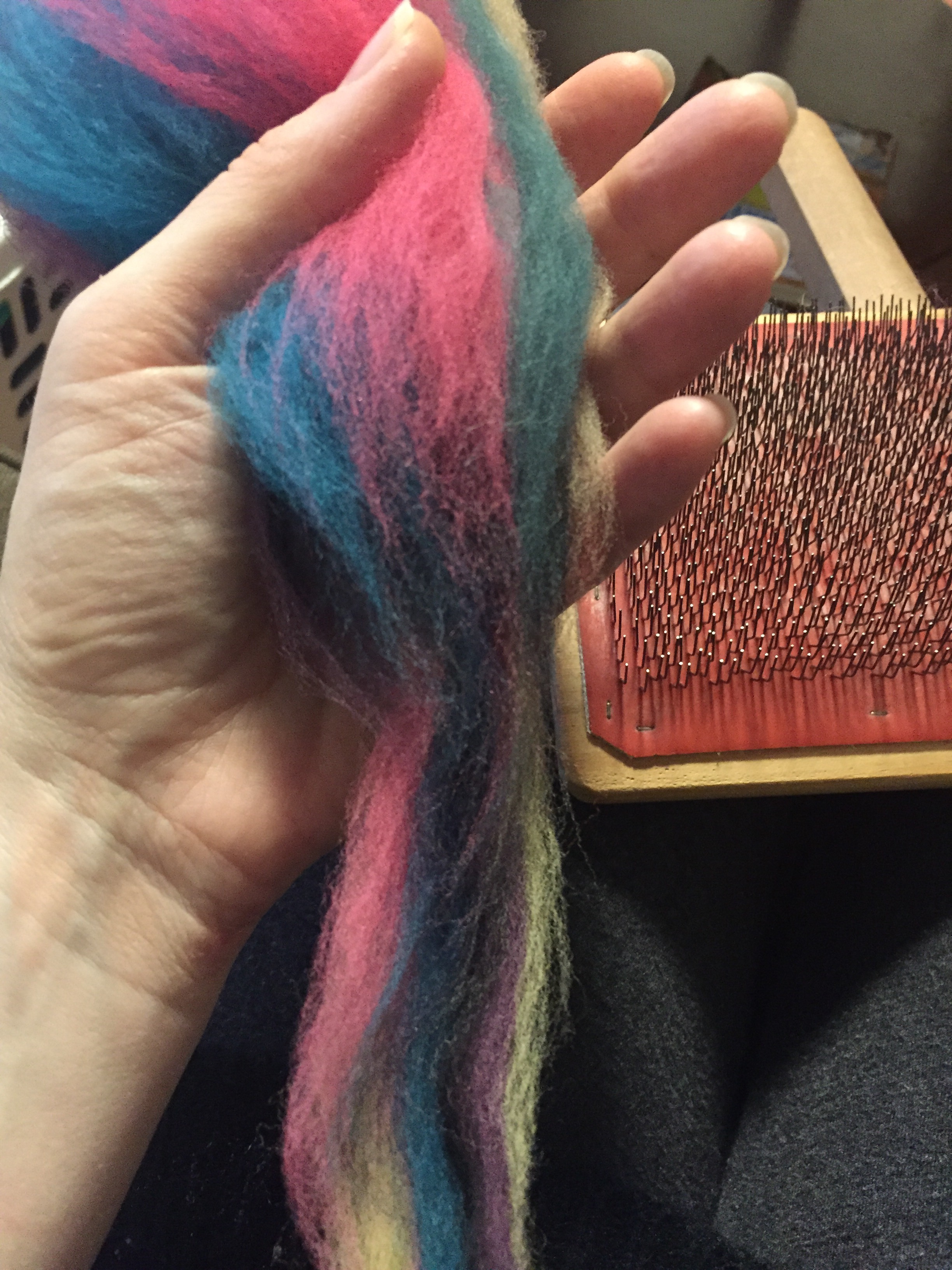 I didn’t want much blending, so also echoing the previous spin, I didn’t actually card at all. I just took the fiber off and rolled it sideways.