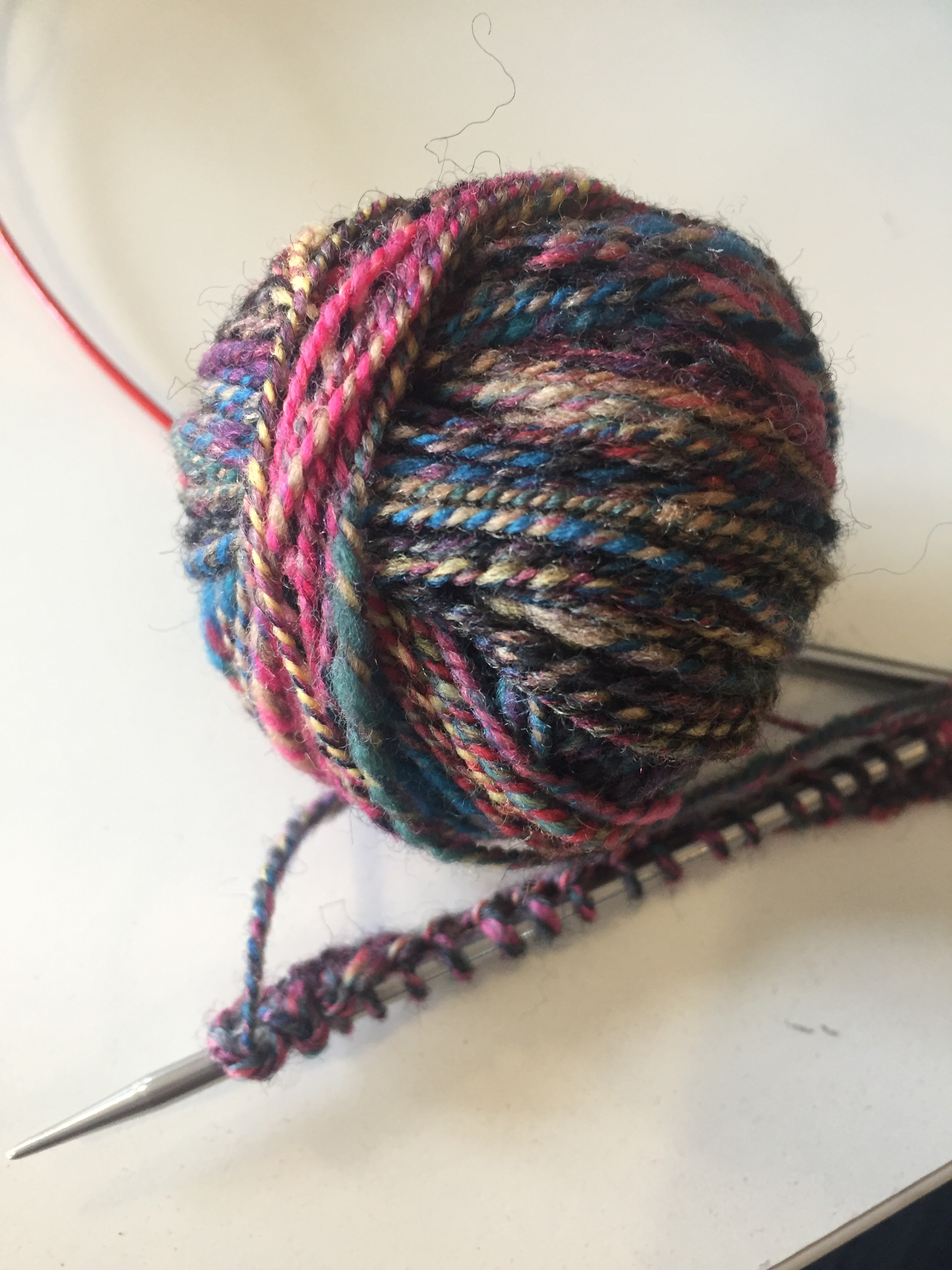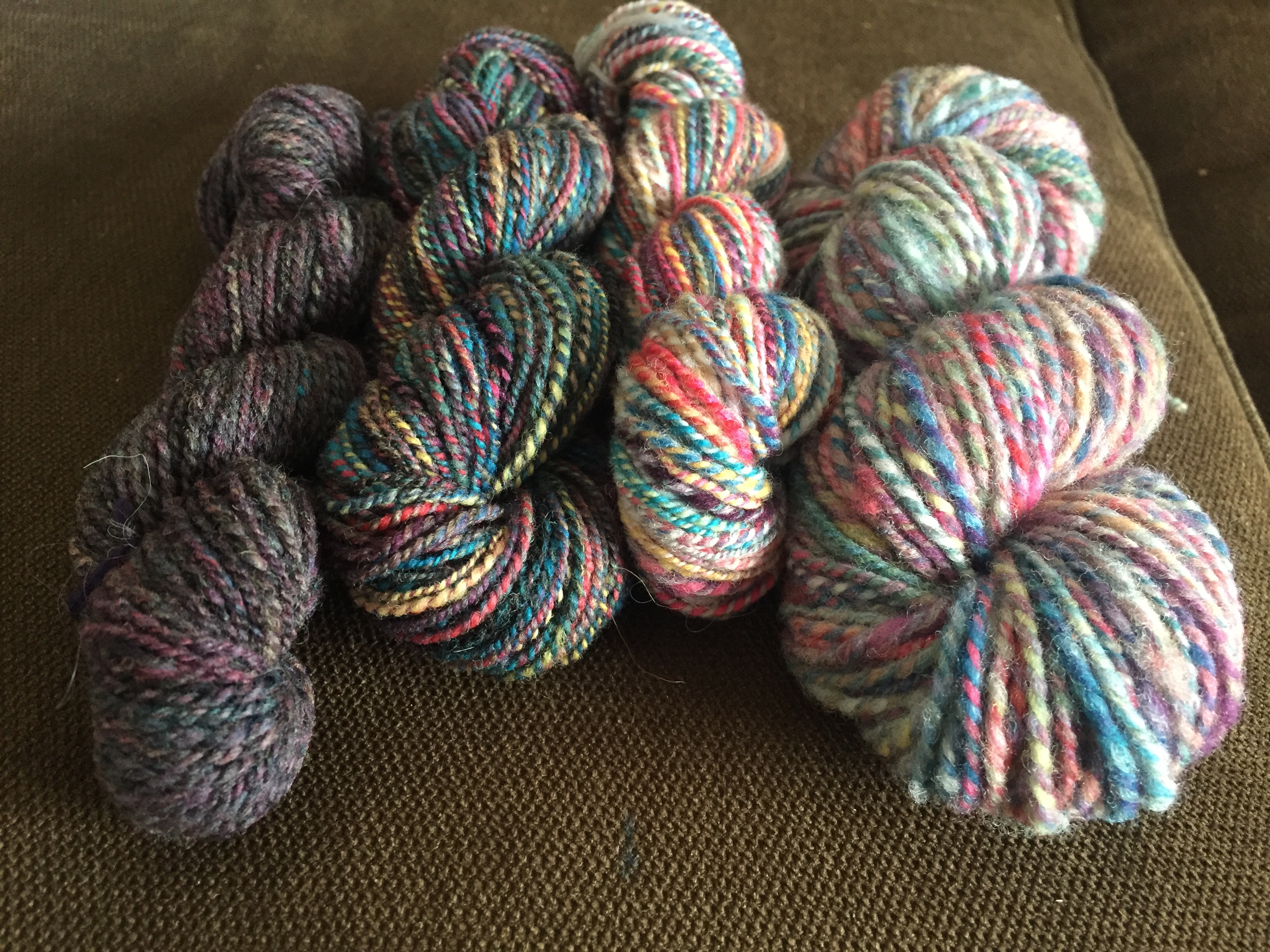 This spin and the previous three have been a sort of mini-series exploring different spectrums: that of worsted to woolen prep, worsted to woolen spinning, of blending white and black with a set of bright colors, and of very blended to less blending of colors. Far too much to explore in just over 4 oz of wool, to be sure, but I like to make the most of what I’ve got.