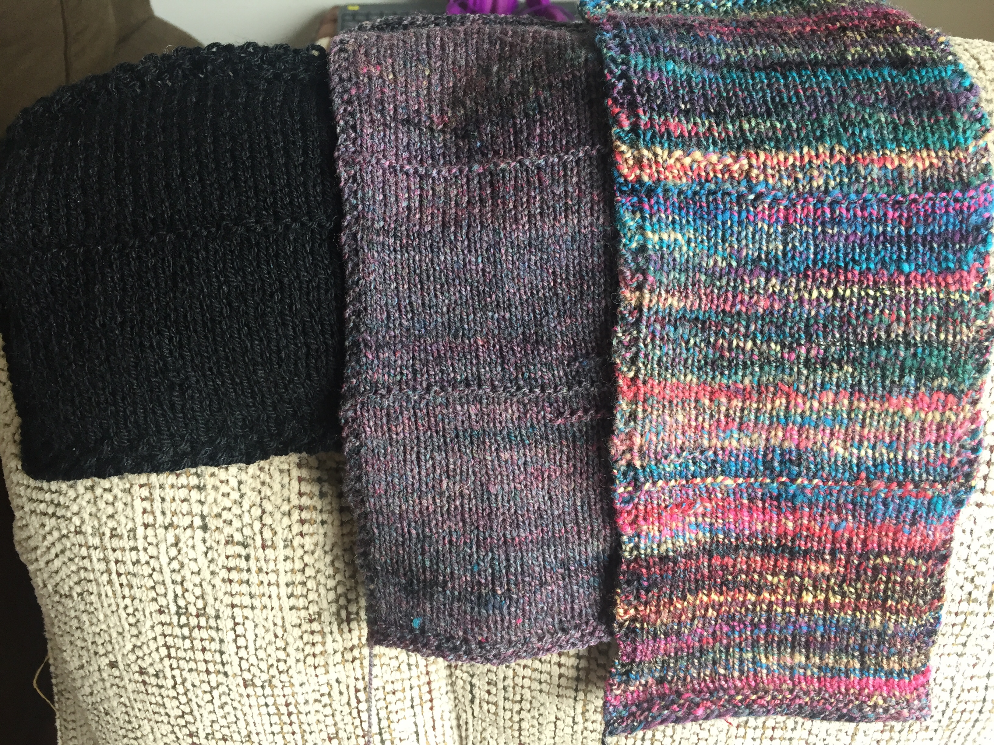 Unlike my human offspring, my swatch children will not be emotionally scarred by my comparing them, so here we go! I find the two black-blended swatches fascinating. The middle swatch above is 1/3 black and very blended on combs; to me the optical blending makes it read as purple. I added less black to the most recent swatch, 1/6. Along with the more minimal blending, it created a completely different look.