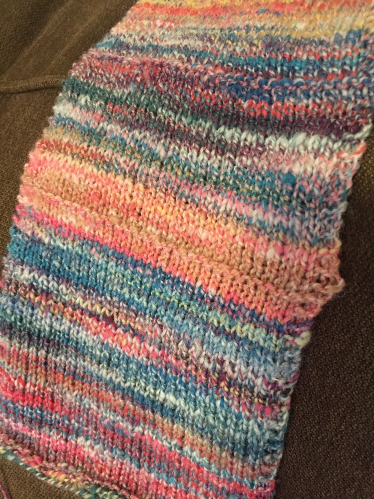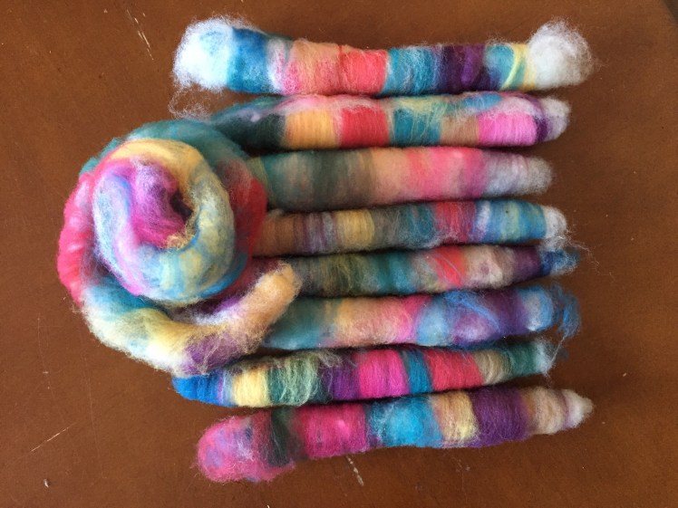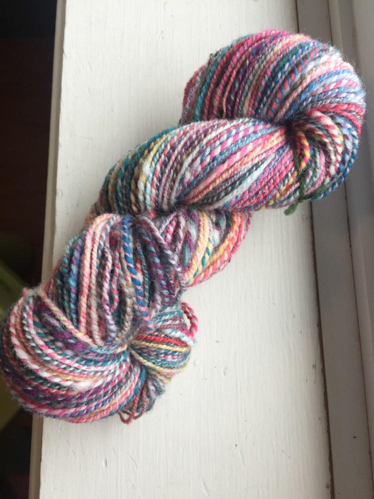 Back in like April, I made these puni style rolag things. I used one hand card as a mini blending board, and made a sandwich with colourful targhee as the bread and white flicked Suffolk as the filling. I spun it short backwards.
