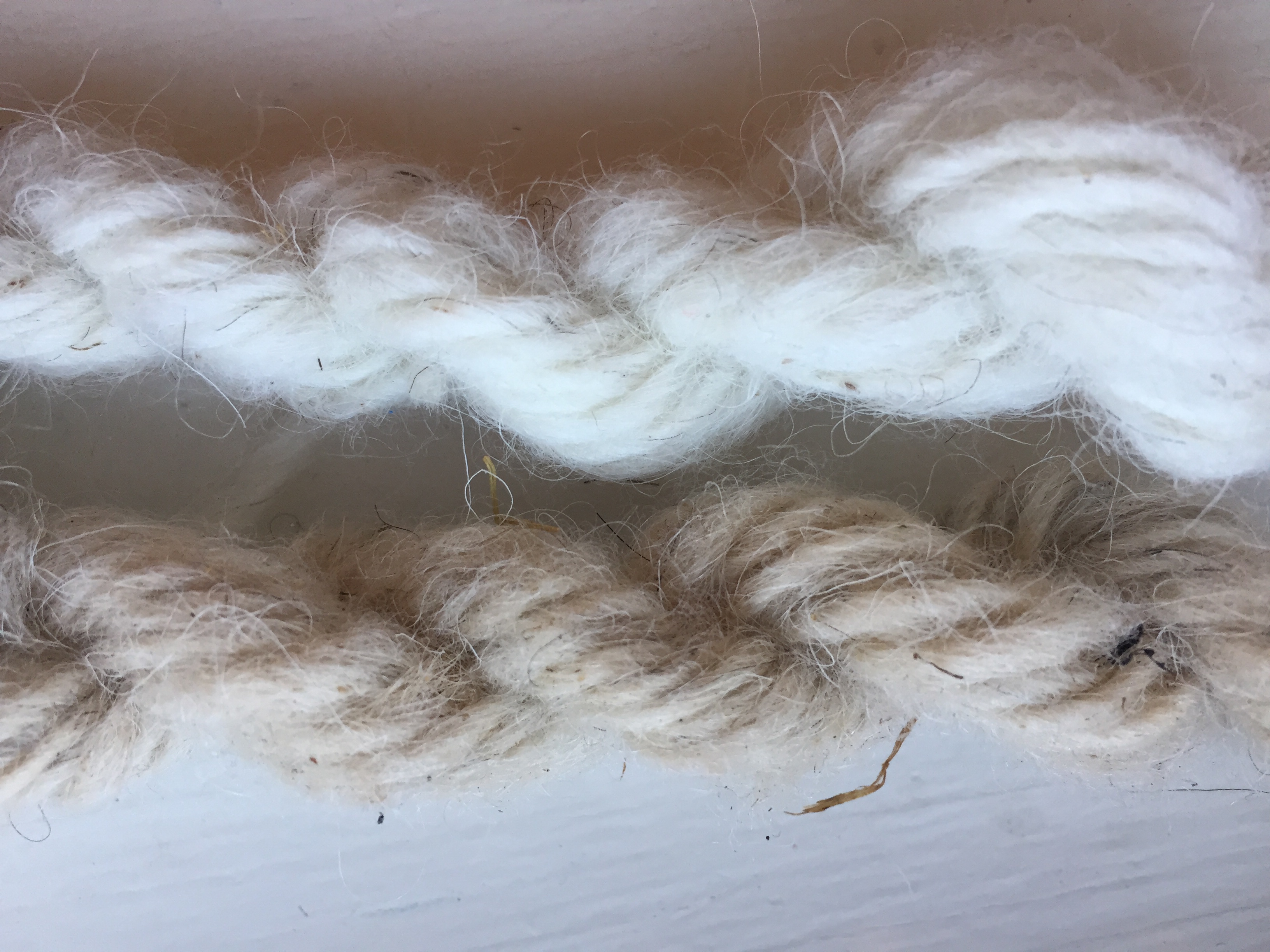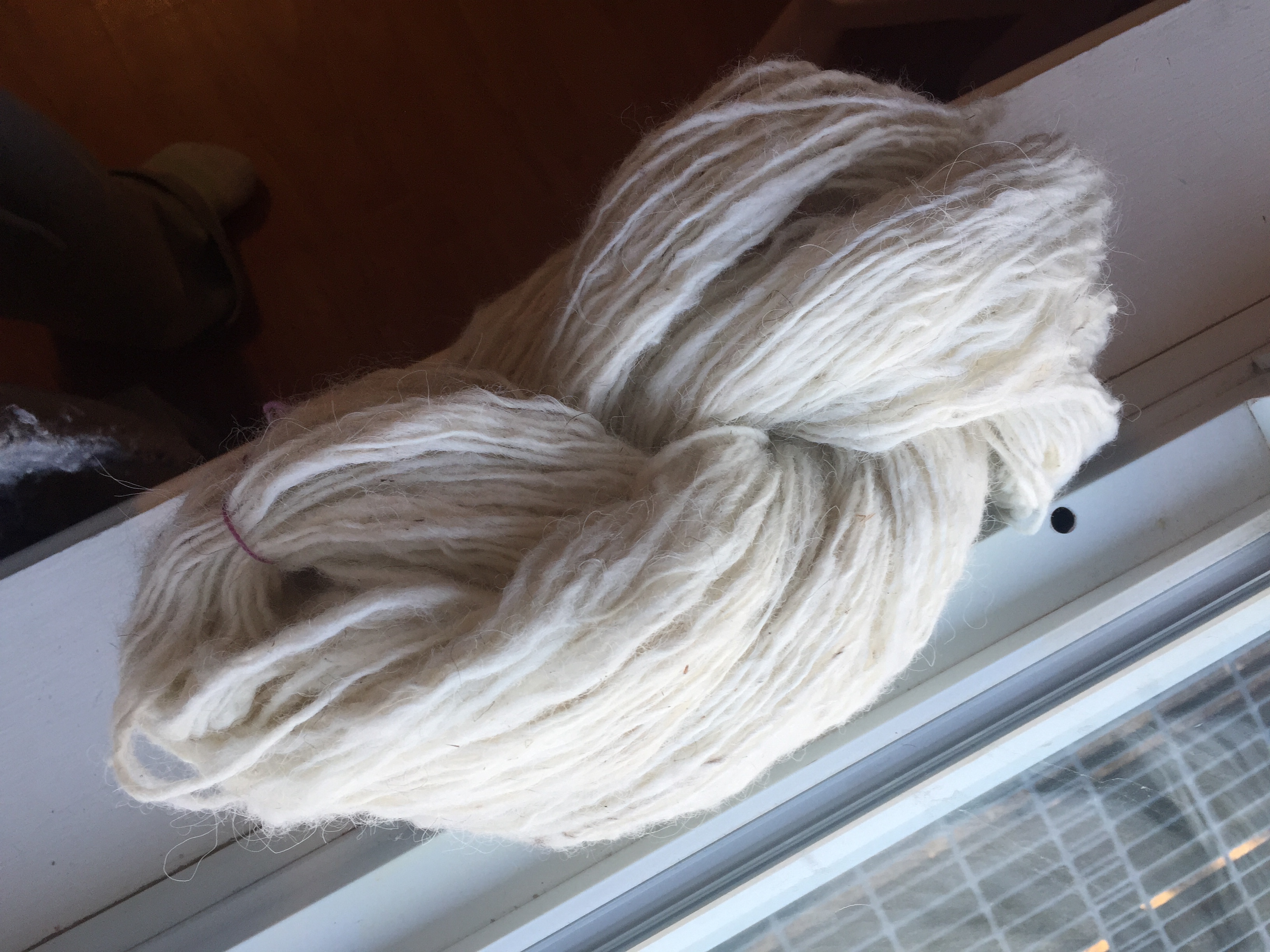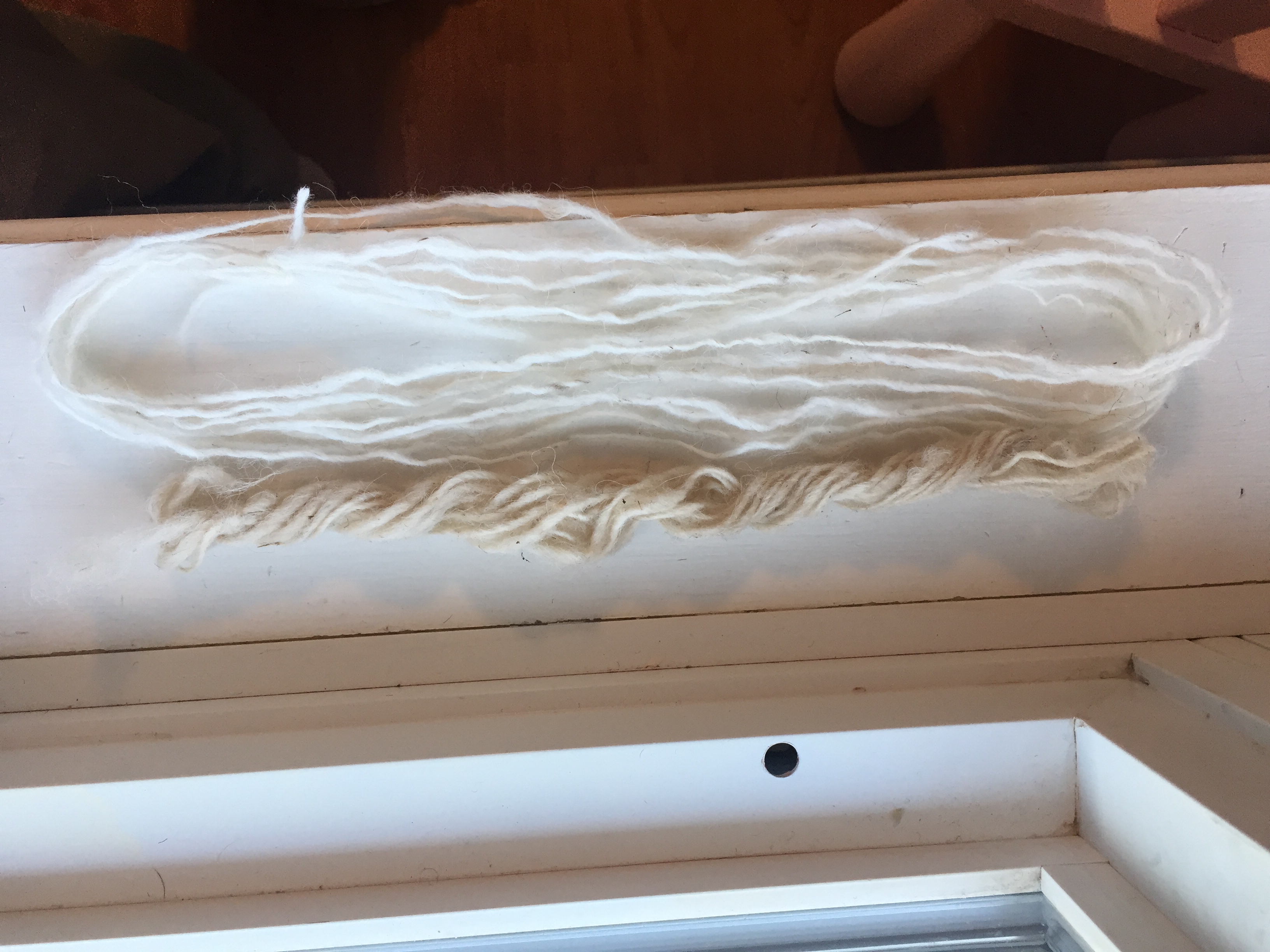 Since this skein is about the grease, I took before-and-after measurements. You can see them all on the spin’s Ravelry handspun page. The wash took away 12% in weight. My yardage estimate is rough, but it looks like I lost about 5% in yardage. There wasn’t a huge change in WPI, and it looks like there was some loss in TPI. For grist, I gained 9% in YPP. Makes sense: losing more weight than yardage means a lighter yarn per yard. I’m surprised there weren’t bigger differences, but probably there was more grease in the truly raw fleece. I washed it poorly, but I did wash something out of it!