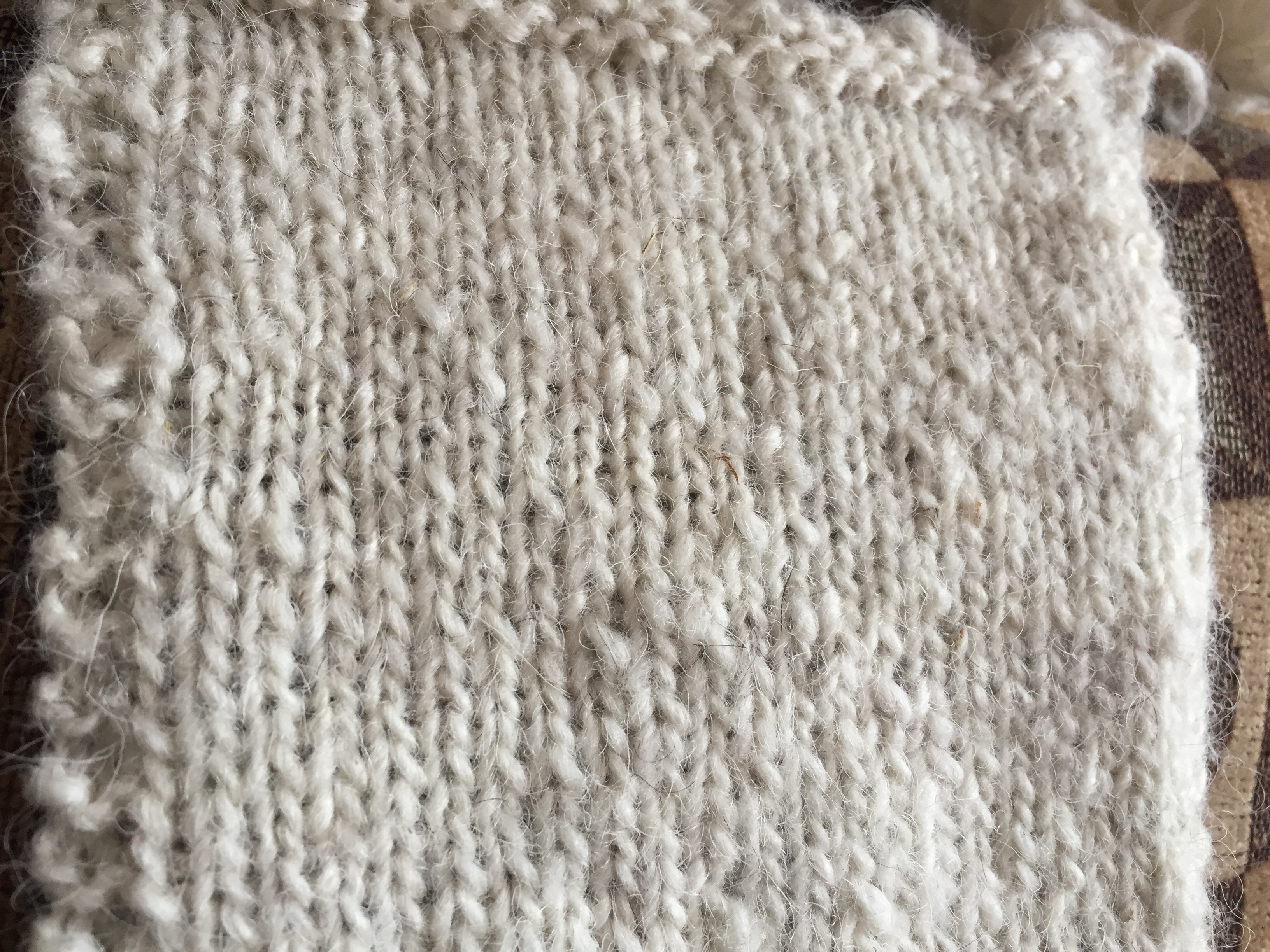 I spun this large batt on faith, trusting that after my previous 1 oz spin, this would be a worthwhile sweater spin. But the final test would be in the swatch. Would the fabric look as nice in white as in black, without the dark color to hide the inconsistencies?