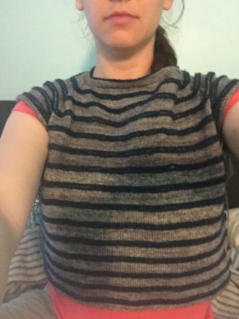 I finished the yoke about a week ago. Sorry for this awful picture. Following the directions for my size, the body is quite cropped. When I’m done the sleeves, I’ll block it to within an inch of its life, put it on with a high-waisted skirt, and see what I think. I have a longish torso, so I’m not going to add the I-cord finishing around the bottom hem until I’m sure it’s long enough. Also I’m not sure about the neckline; I did it twice and it’s still very tight. Again, we’ll see how it responds to a firm blocking.