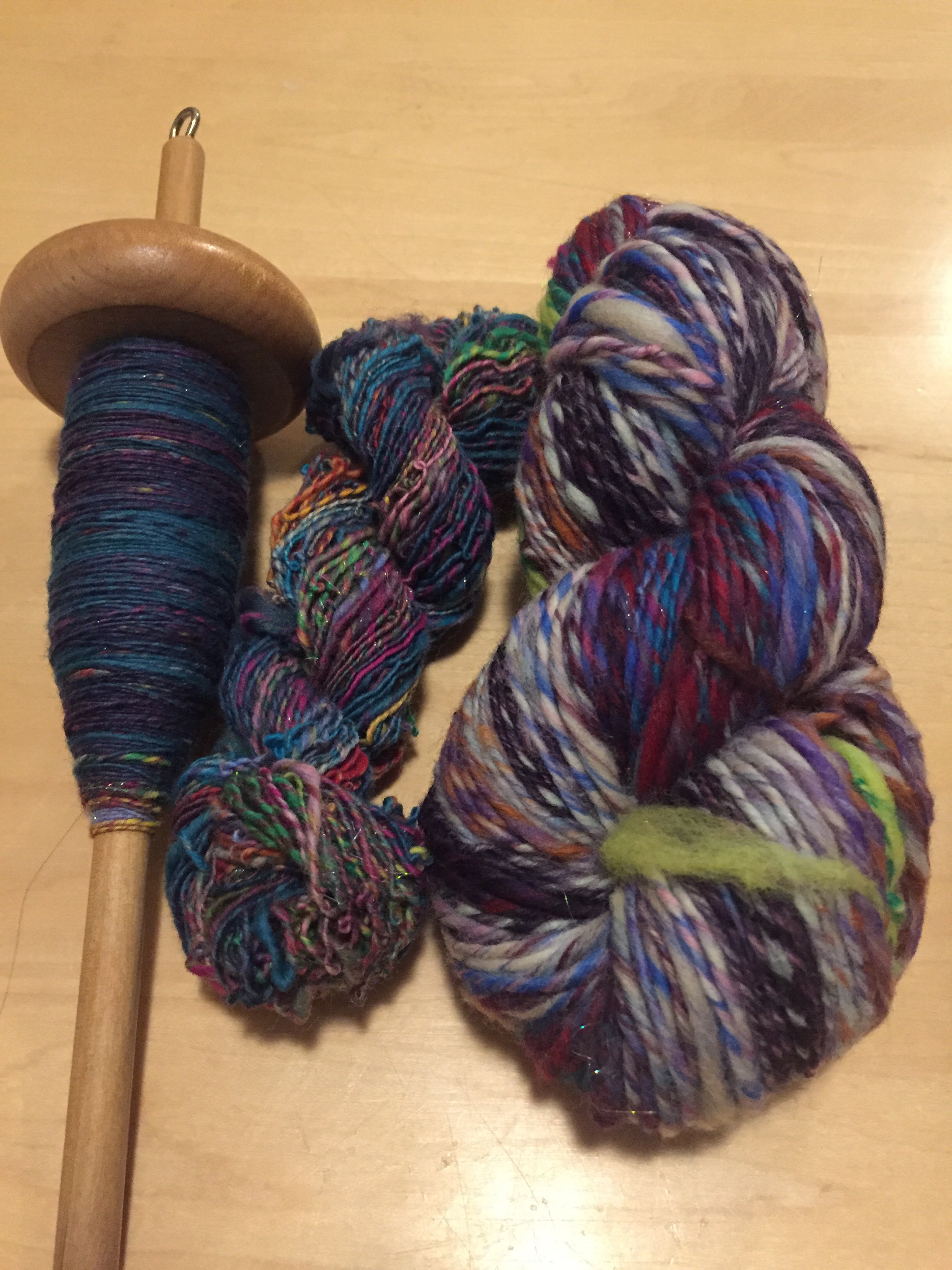 I was not expecting to do any spinning this month, but I brought my drop spindle and some fiber with me to Iqaluit. This month in 51 Yarns was all about singles, and I managed to get them all spun. I am not ready to do their posts because they all still need to be finished and sampled, but here’s a little awful picture for a sneaky preview.