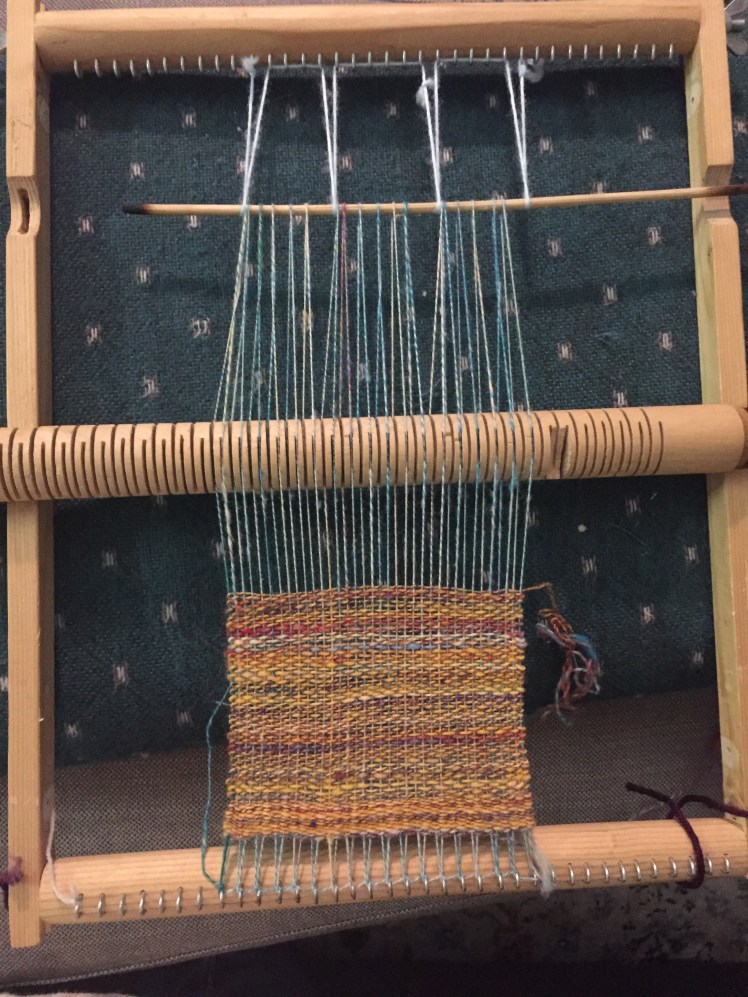 I did this sample on the tapestry loom. Do you like my improvised apron rod? This setup worked very smoothly. On the rigid heddle loom…