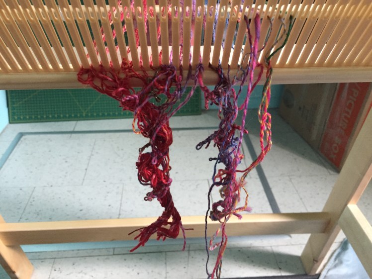 The difference, of course, is that in warping the tapestry loom I could keep the singles under tension. On the rigid heddle, I attempted to use the direct warping method. As soon as I finished beaming on and let the ends go, I got a hot mess. I’m sure there are better ways to do this; I just don’t know them yet. The singles made such a great warp on the tapestry loom that I can see it’s worth trying again.