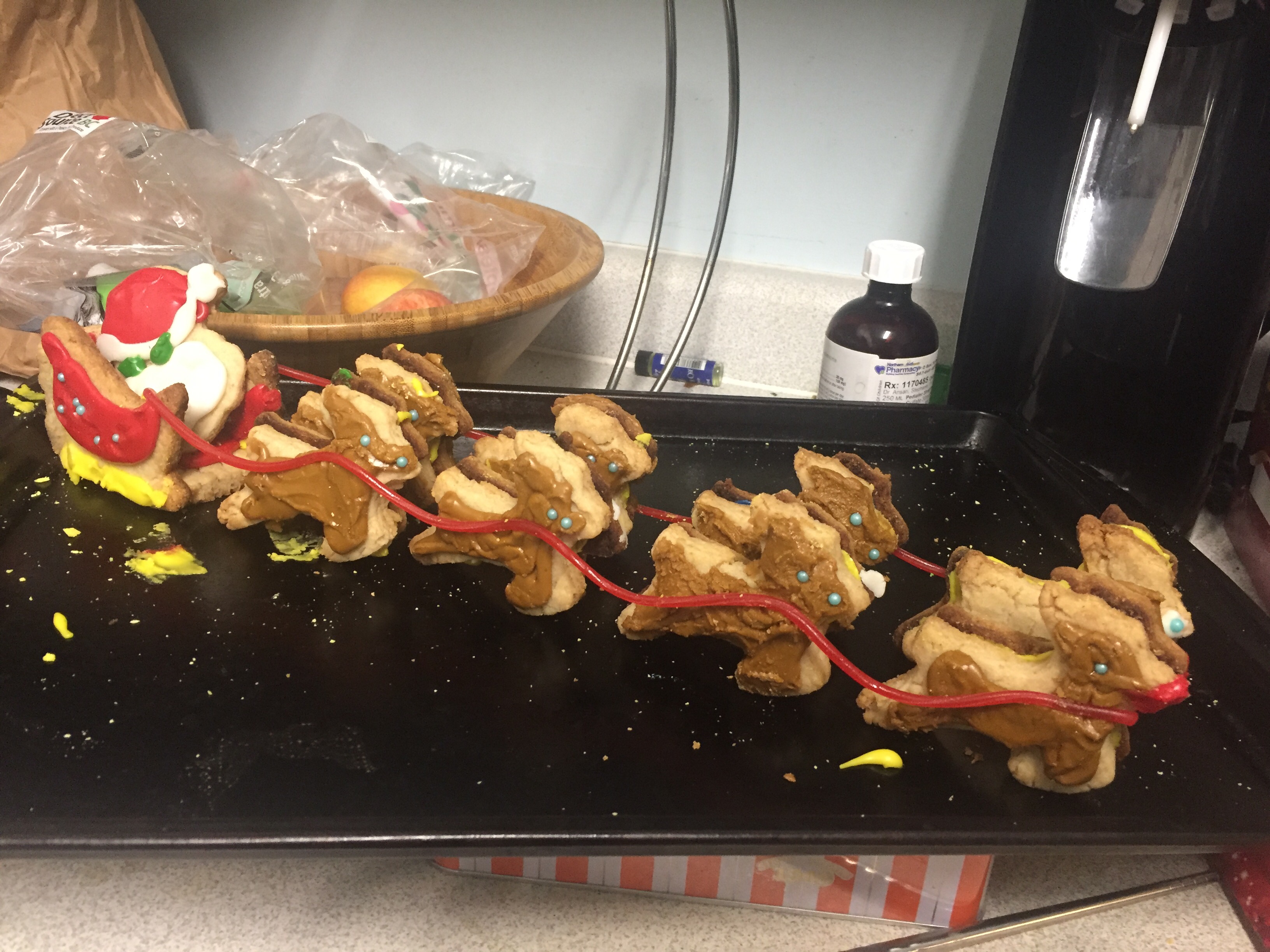 In place of the gingerbread house, we made sugar cookie Santa and his team of reindeer.