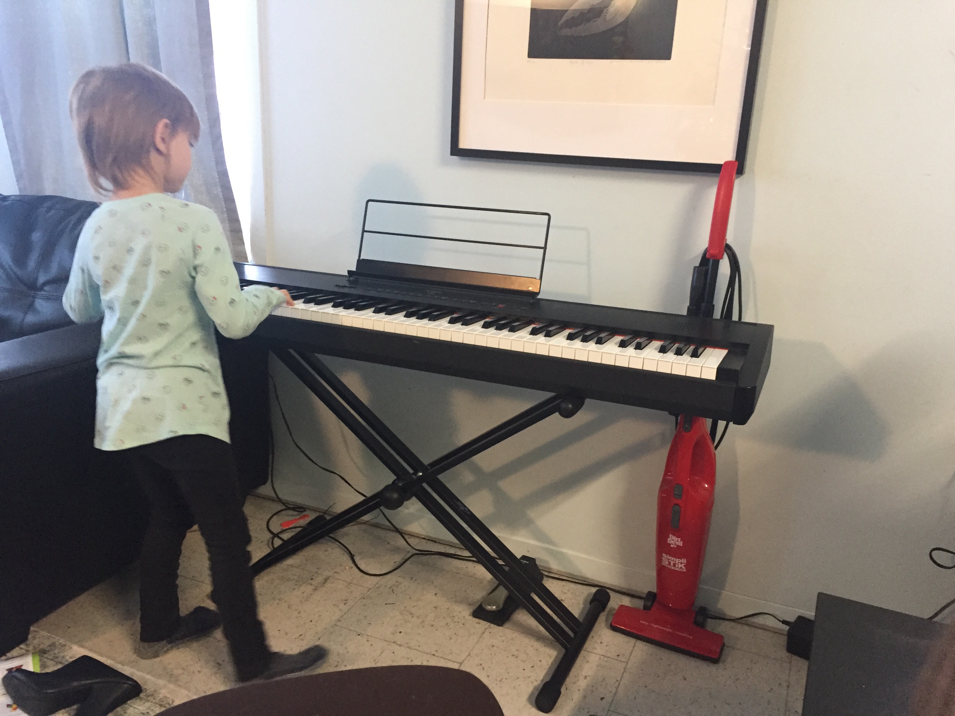 There was some rearranging of furniture to make room for our tree. Then, when I finished weaving Christmas gifts, I took down the loom so we could finally put up our inherited keyboard. Jared has high hopes of teaching our girls to play, and I’d like to learn too.
