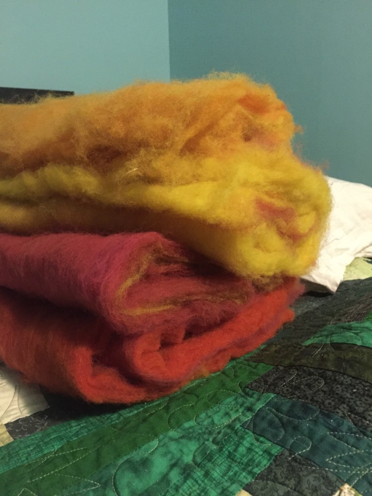 I bought this batt around 9 years ago, when I was first getting into spinning and buying too much fiber. It was 8 oz, and cheap for that quantity. The label has no info on what kind of fiber it was or where it’s from. I thought the layering was pretty interesting. It was from a small farm stall, my fuzzy memory tells me. I nabbed it on a whim, but Orange isn’t really my colour, though, so I never got around to spinning it.
