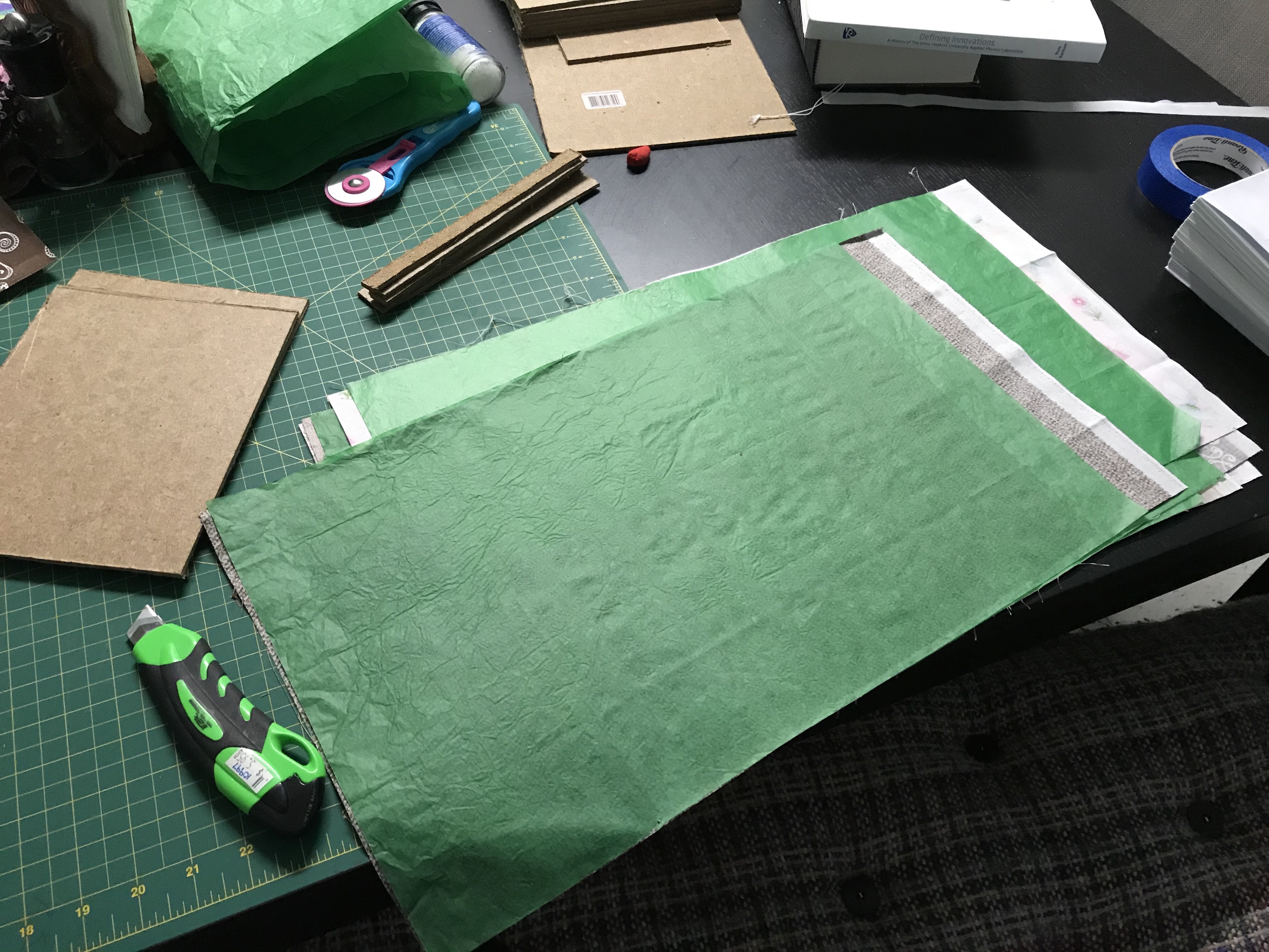 Making book paper out of fat quarters (also from the dump), heat bond, and tissue paper…