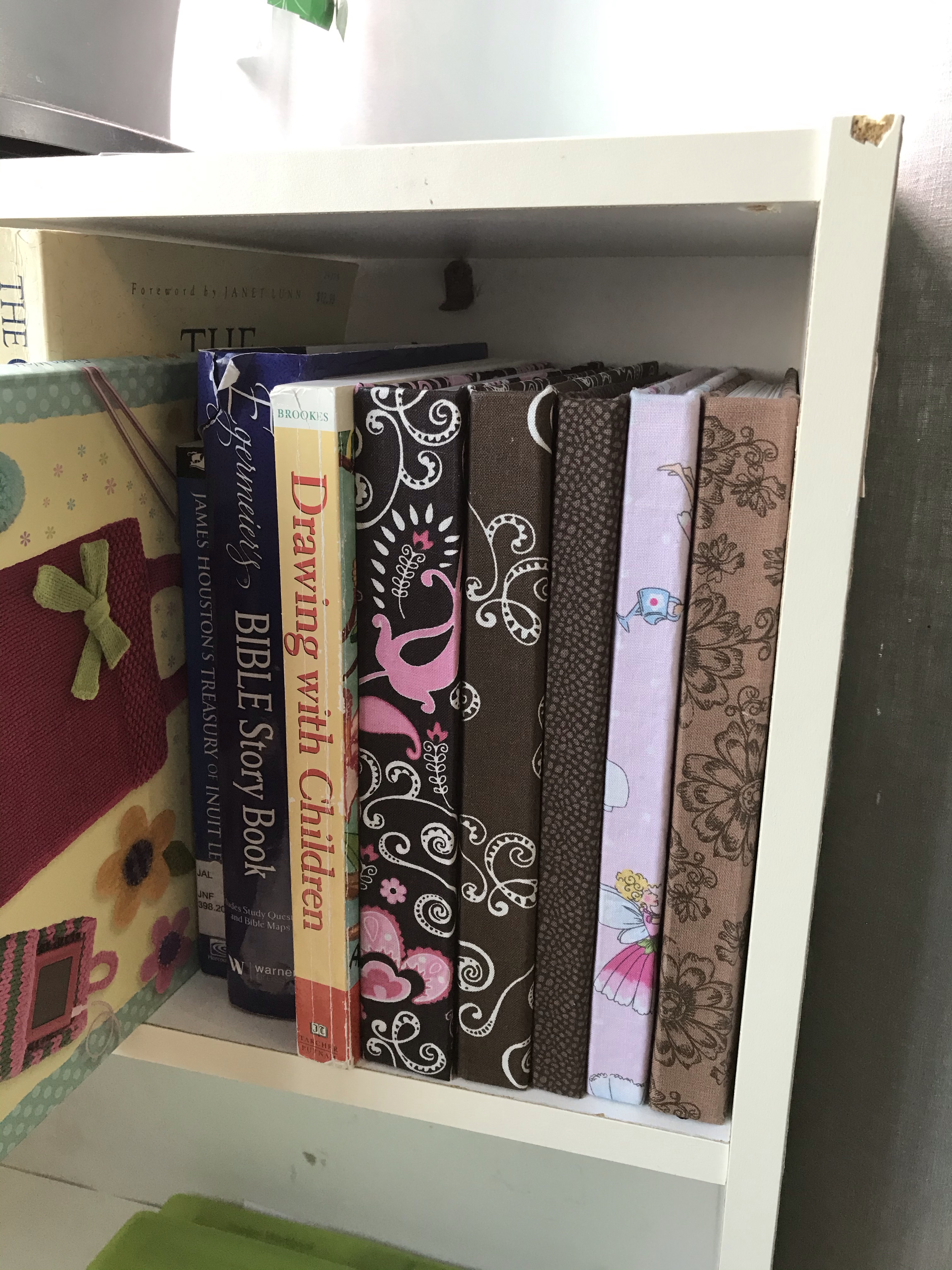 I seem to have reached some kind of crafting critical mass in which I have nearly all the tools and supplies ready to DIY something totally off the wall like this. I had to buy an awl, heat bond, and the right size brush (rather, husband did during emergency hardware store run); everything else was on hand or a dump find. The $20 or so dollars we spent saved us over 100$ in books, so I’m feeling pretty good about it. The kids really value these special school books we made together, and look forward to using them. Also it was a great distraction while I transitioned home.