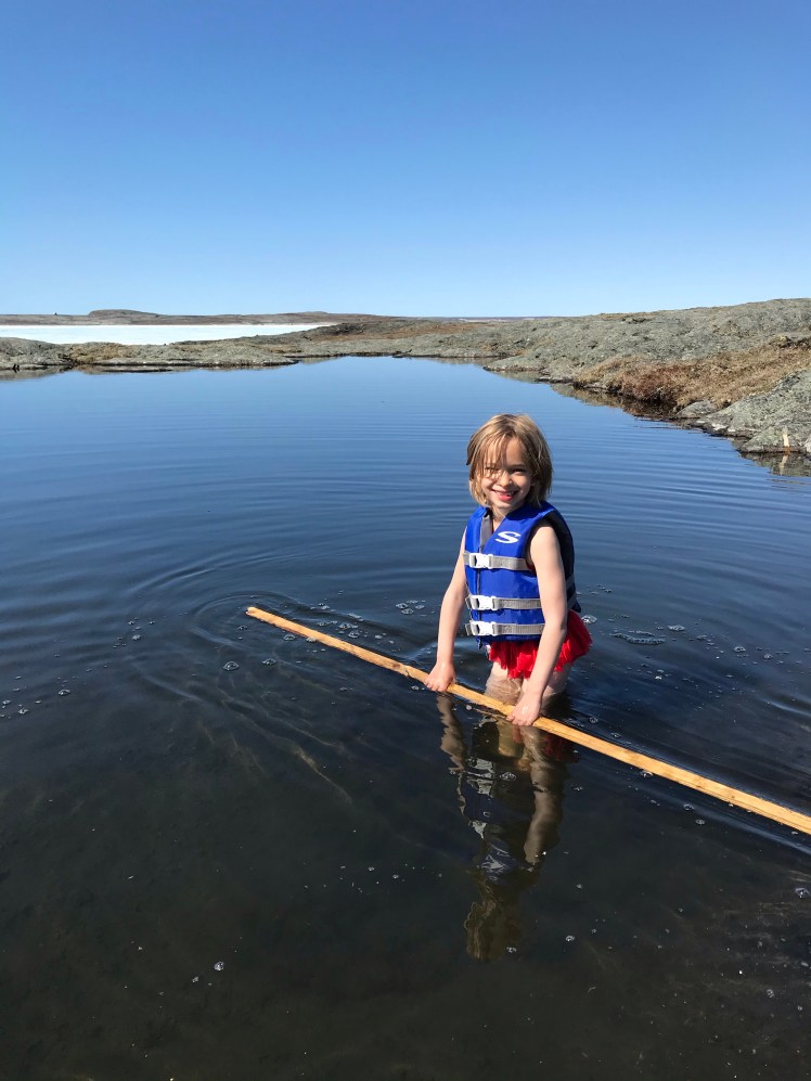 The biggest excitement was swimming. Tuesday topped the charts at 21 degrees C. Some of the snowmelt pools near the cabin got warm enough in the sun for a dip, if you were brave enough. I chanced a short swim myself, though I didn’t last long – the ground under the pools is still frozen, so in portions that are deep enough to prevent the sun penetrating, there’s a layer of ice at the bottom. That makes for very chilly wading. Still, there’s nothing quite like being in your bathing suit in a pool overlooking a still-frozen bay.