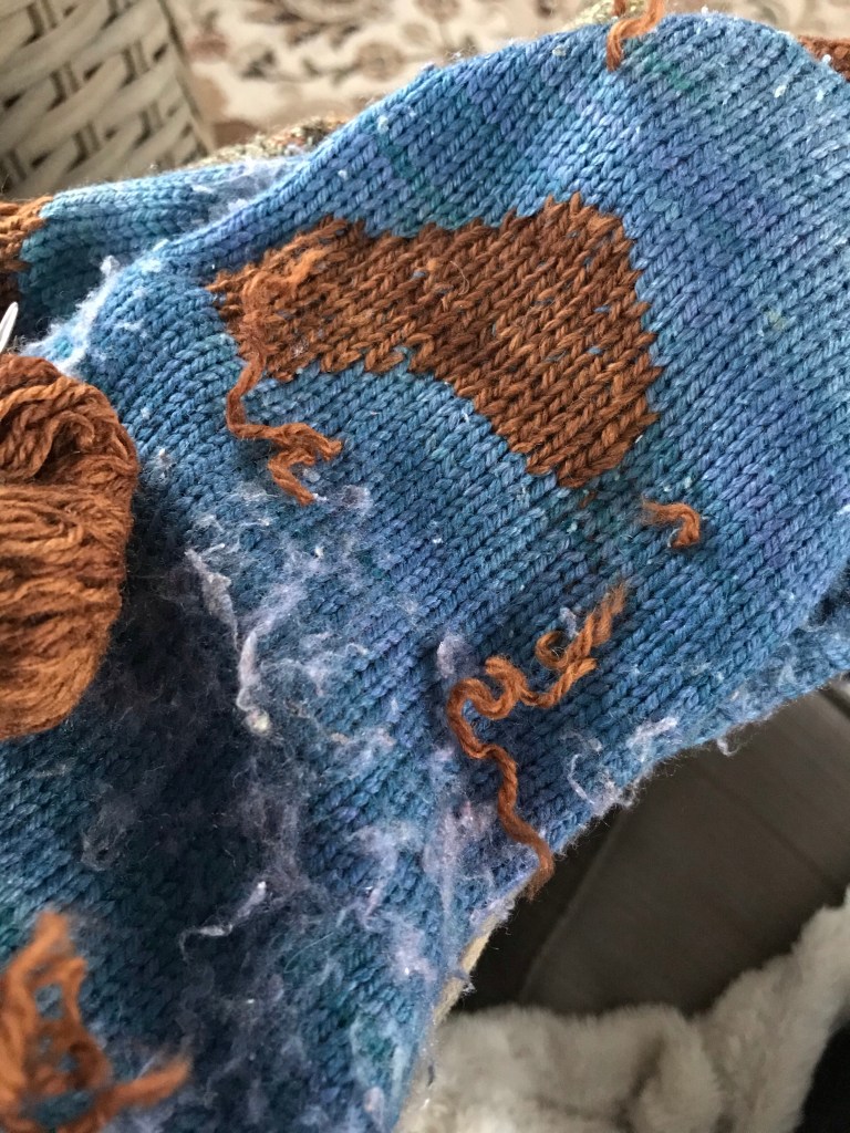 I’ve gotten pretty good at making a solid darn, adding further rows to the weave after the basic structure. One new angle this time was having to darn heels. That was interesting because there are fewer stitches below the hole than above to sew through. But since purl stitches have two sort of levels to them which are off-center from each other, it was simple enough to sew through both levels below and one level above. There was also the complication of darning over slipped stitch floats on the heel flap.