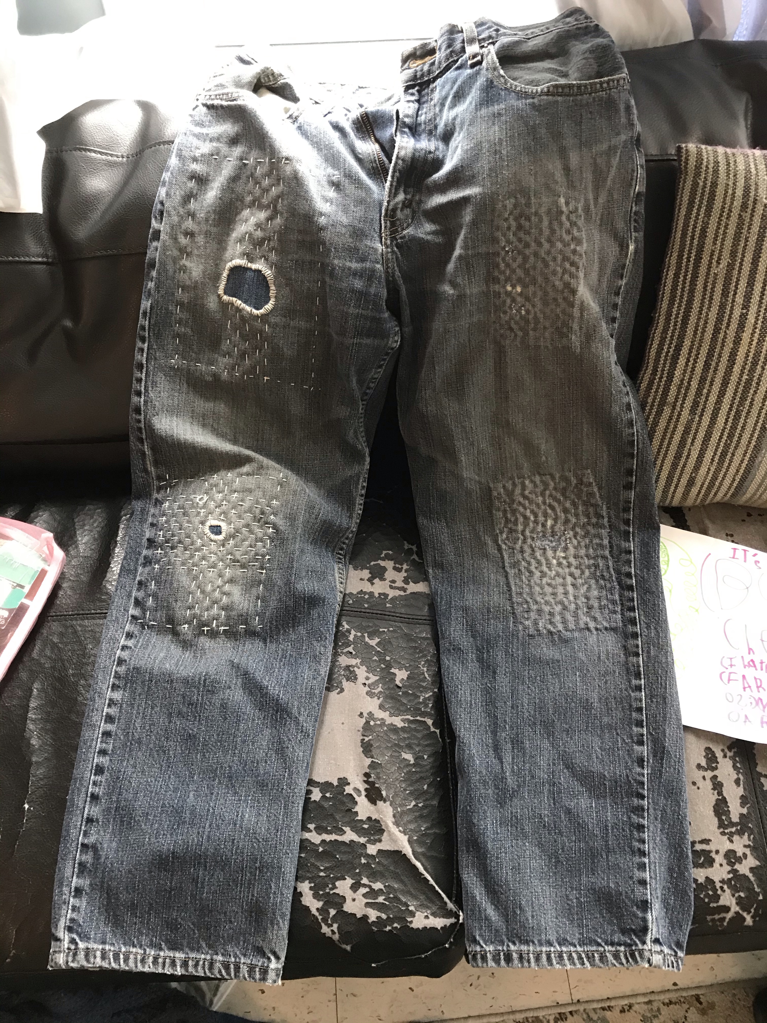 First I did some work on holey jeans. Jared has enjoyed wearing his repaired jeans so much that he wore new holes in them. I was emboldened to make these new fixes more visible.