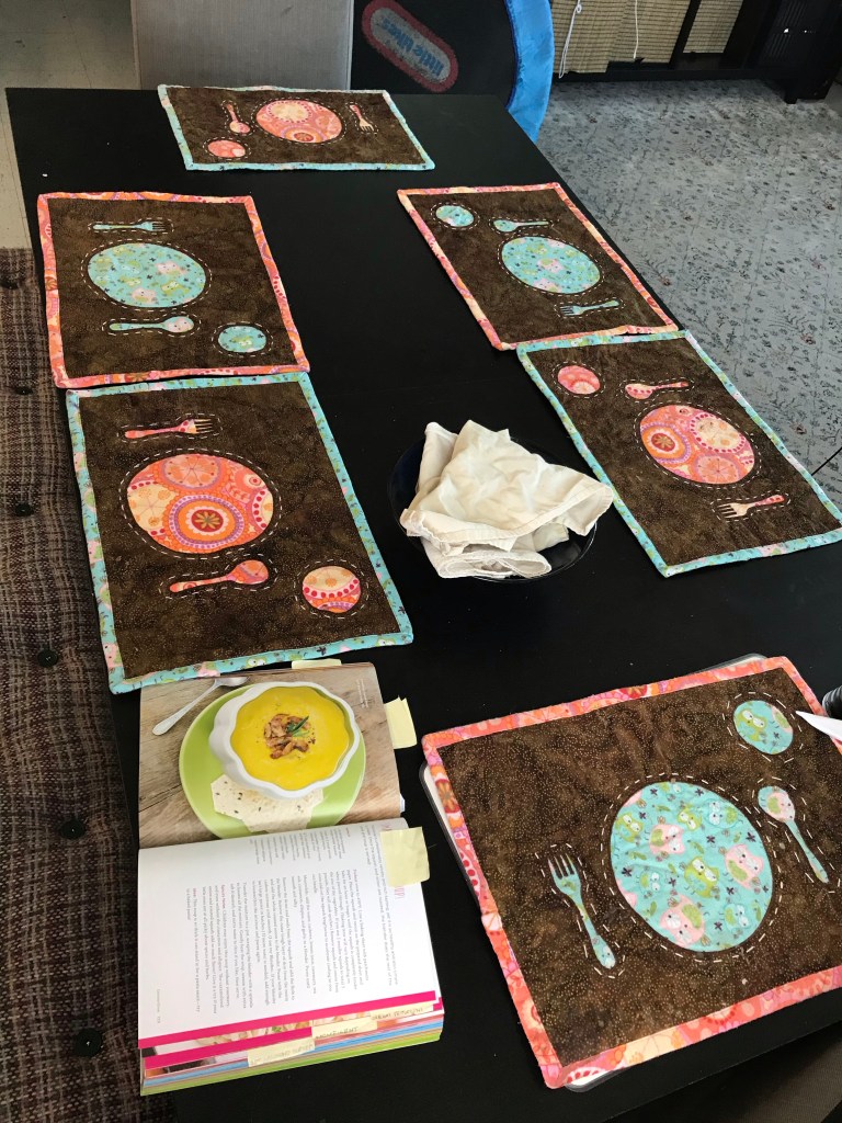 These were actually an excellent cabin project; I’ve brought them out a few times. I’ve gotten awfully speedy at backstitch through four layers. And the really important part is: I am now able to get Stringbean to set the table!