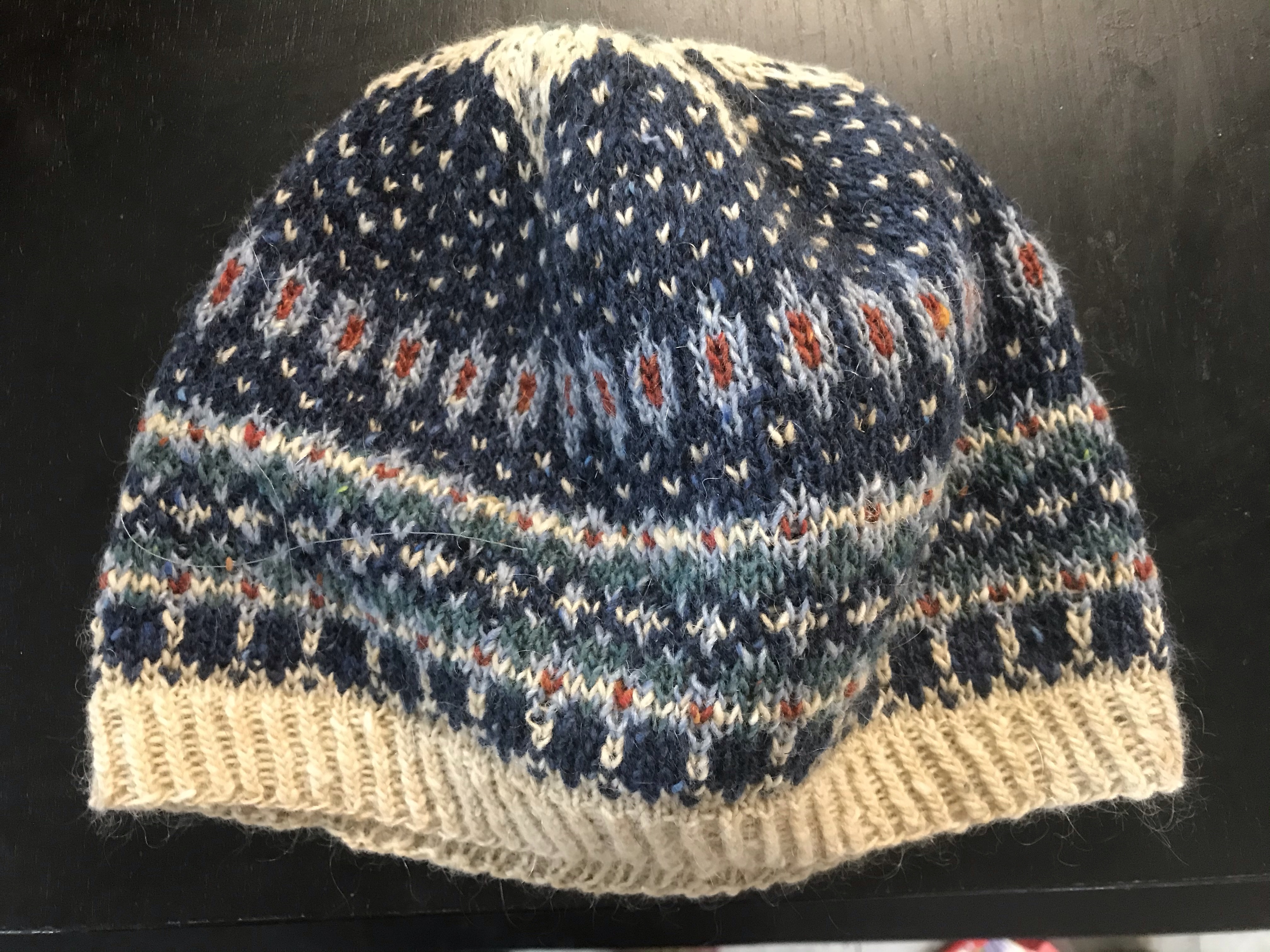 For years I thought this meant that you should always hold the “foreground” color in the right hand, so it pops, and the “background” color in the right hand. However I’ve learned more recently that this varies, especially with very small motifs. For me at least, large single stitches tend to engulf the stitches directly above or below them. This might be what I want if I’m continuing a vertical line; that is not what I want if I’m making a dot, or starting or finishing a line, or making a small motif inside a narrow horizontal stripe. I made guesses in this hat, and while I’m not happy with every row, I’m happy enough. It would be nice if patterns like this included row-by-row suggestions on which hand to use for which yarn. But that might not be feasible; not everyone knits fair isle this way, nor do they have the same tension differential between hands that I have. And as always, blocking helps.
