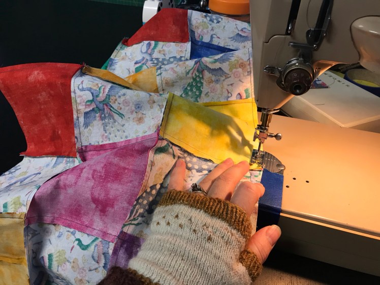 I think the appeal of quilting for me, aside from the obvious fun of playing with colors, is the fascinating efficiency of construction. Seeing something beautiful come together so quickly, even though it’s made of small pieces, is a little intoxicating. And since I’ve finally got my sewing machine working very happily, piecing is a truly joyful process.