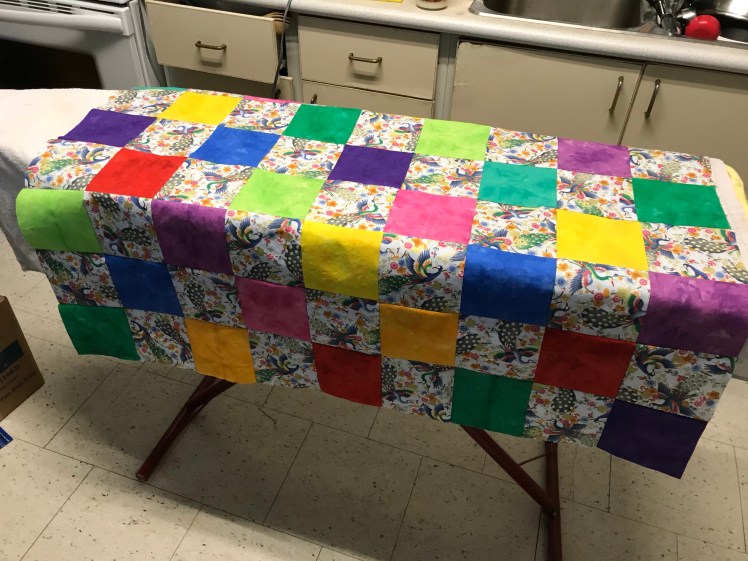 I found a contrast fabric at the hardware store, where all the best fabric is sold in the Arctic. I had to wash, starch, and cut those squares too, then the piecing began.