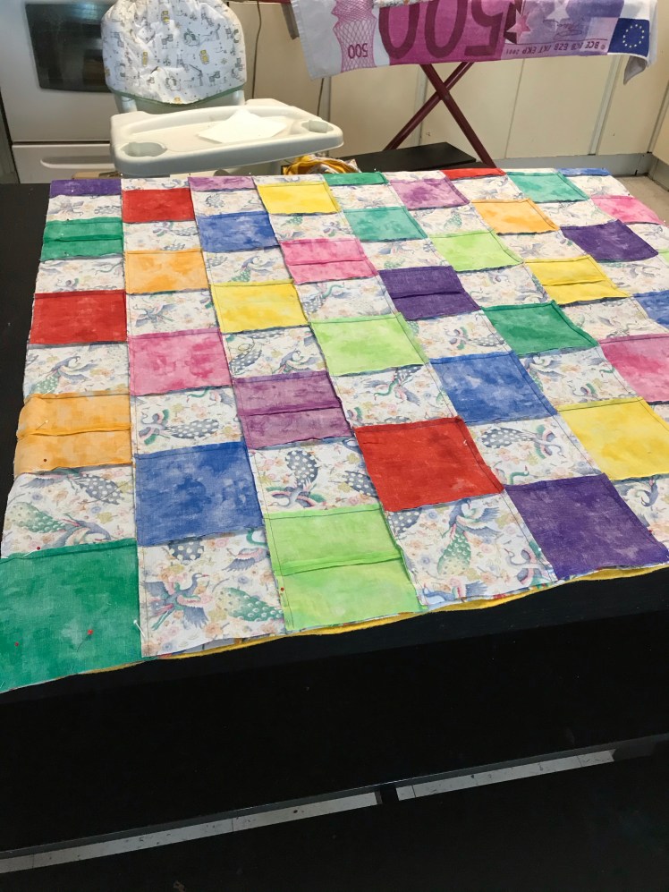 What a lovely quilt! I’m sure it’ll be well received. I adore the sparkly fabric and it works so well with the bright squares.