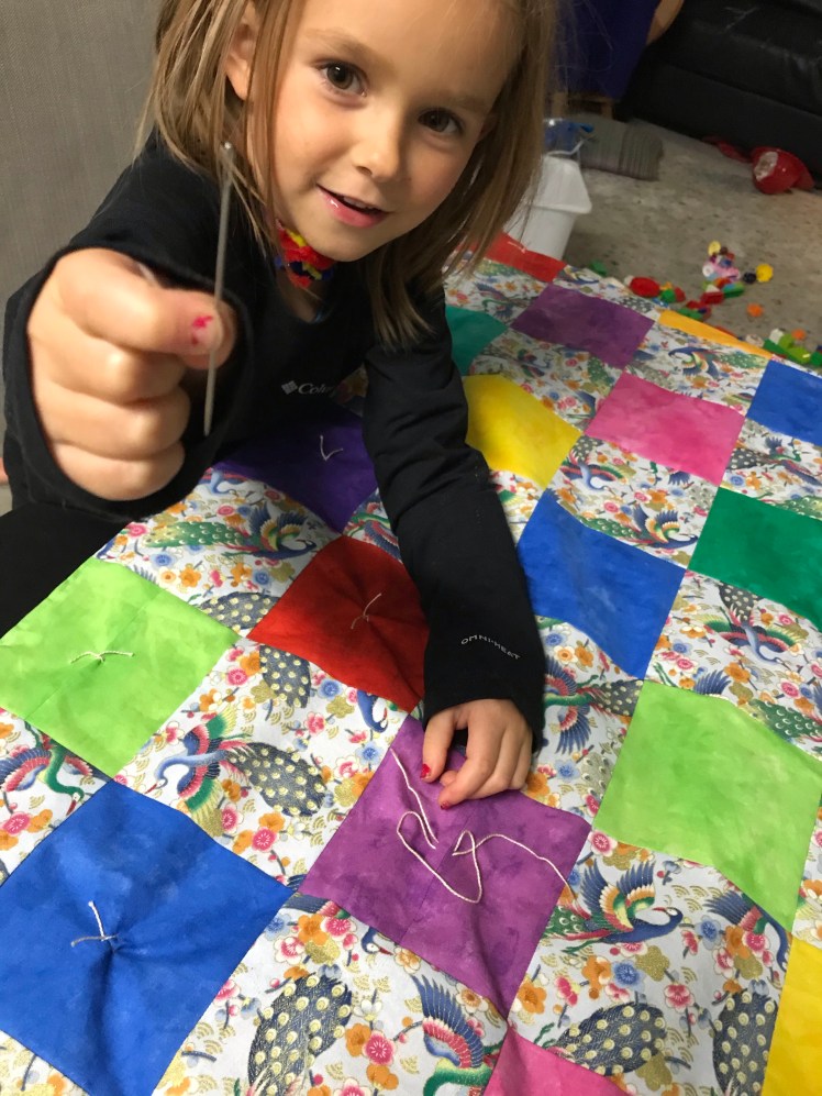 The quilt-tying process went much faster than I thought. I worked on it while Jared read the girls their bedtime story, and by the time they noticed what I was doing, it was time for bed. But Stringbean had to have a go at tying some. She loved it, and wished she could stay up and do more. I might have to tie my next quilt just so she can do some of it.