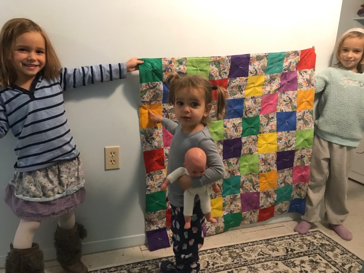 Thanks to the three ties they contributed, the girls are as proud of the finished quilt as if they had made it themselves.