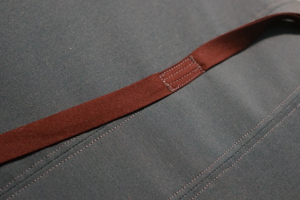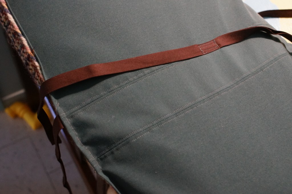 I bought thicker bias tape for the ties this time, and came up with a different arrangement. I put one long tie in the center, and instead of just tying that around the little crossbar under the bench, the ties reach to new side ties. These are way sturdier and have successfully eliminated most of the wiggling – of the cushion, not its occupants.